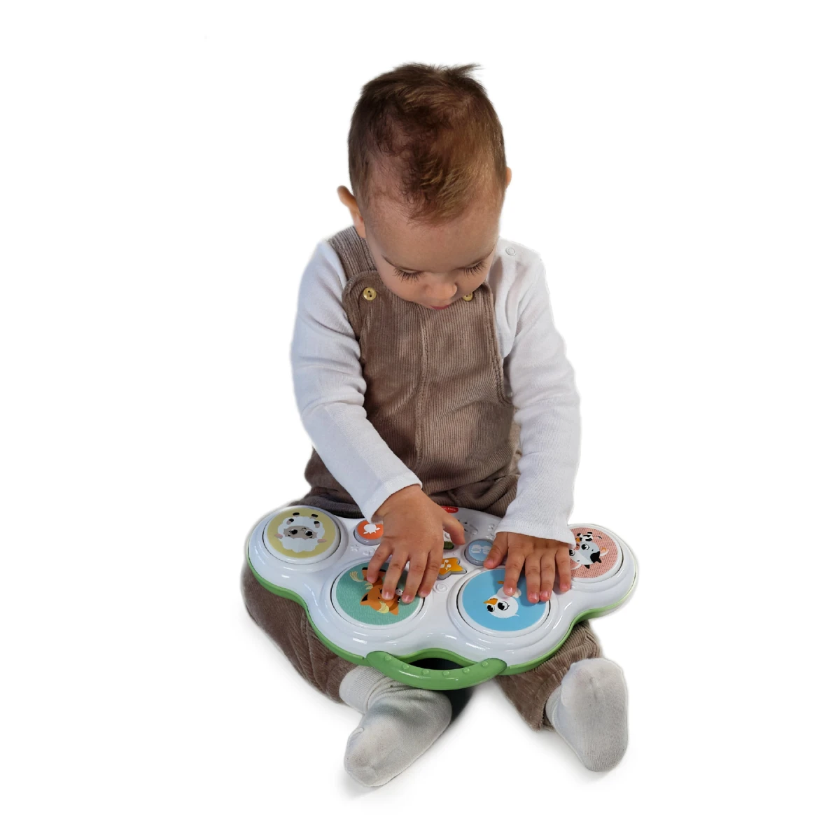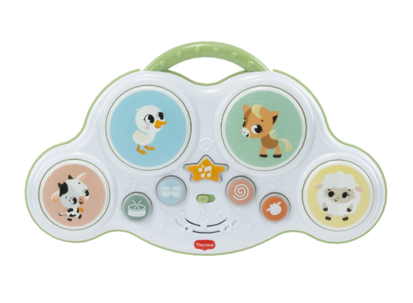 Hudobný pult s bubienkami Tiny Love Farmers Funday deti zábavnou formou motivuje k objavovaniu zvukov, rytmu aj zvieratiek. Štyri bubienkové plochy a svetelné tlačidlá spúšťajú bubnové rytmy, vtipné zvuky i farmárske zvieracie efekty, takže hra dieťa dlho udrží v pozornosti.