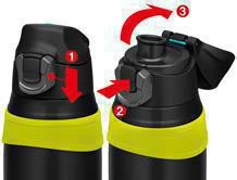 Otvorenie termosky je veľmi rýchle a jednoduché. Termosku otvorte iba jednou rukou. Postup: 1 - odistenie zámku, 2 - stlačenie spodnej časti tlačidla, 3 - viečko termosky sa otvorí.