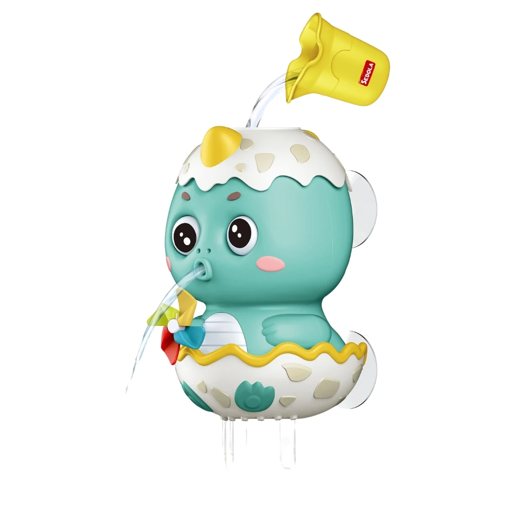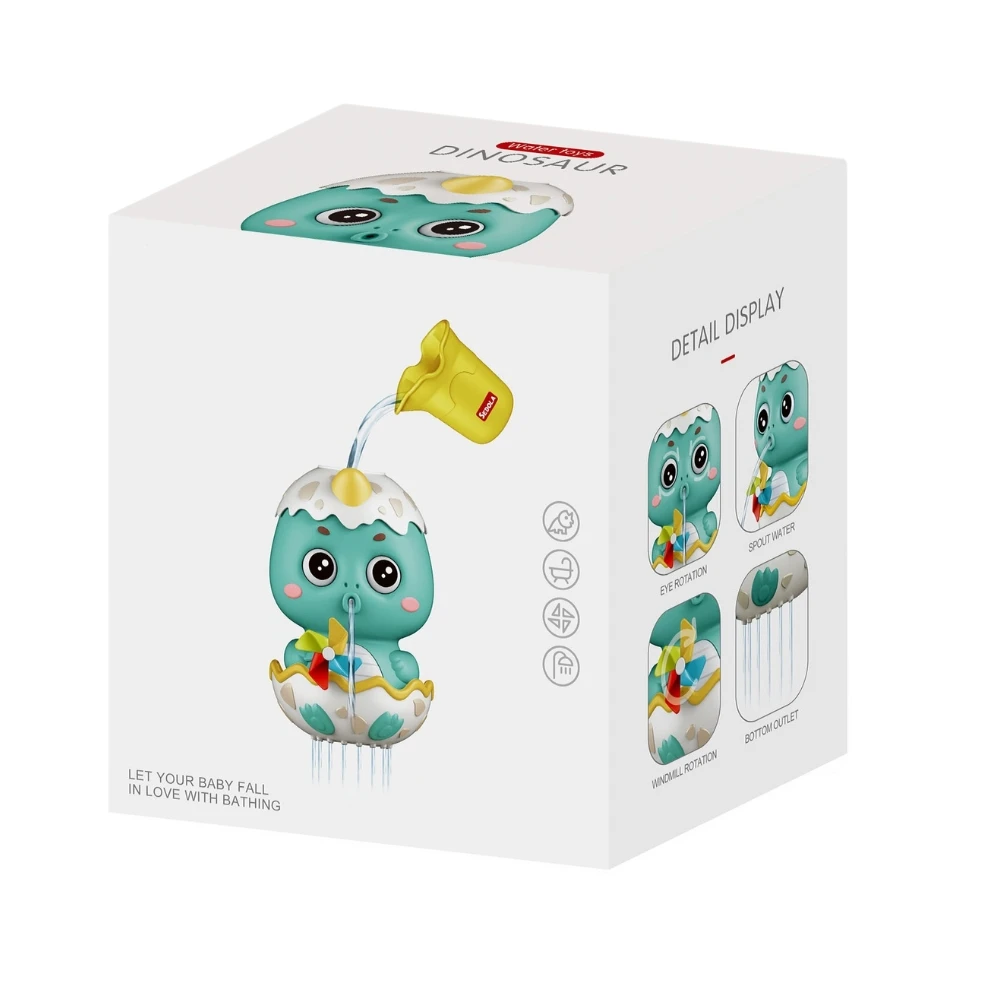 Interaktívna kúpeľňová hračka Dino je veselý dinosaurus schovaný v škrupine vajcia, ktorý premení každý kúpeľ v malú vodnú show a motivuje deti, aby sa tešili na kúpanie.