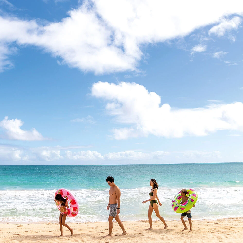 Na výber sú obľúbené motívy ananásu, melónu alebo jahody, ktoré vďaka výrazným farbám a detailnému spracovaniu okamžite zaujmú. Kruh je vybavený dvoma pevnými madlami, ktoré zaisťujú lepšiu stabilitu a pohodlné držanie pri plávaní aj odpočinku.