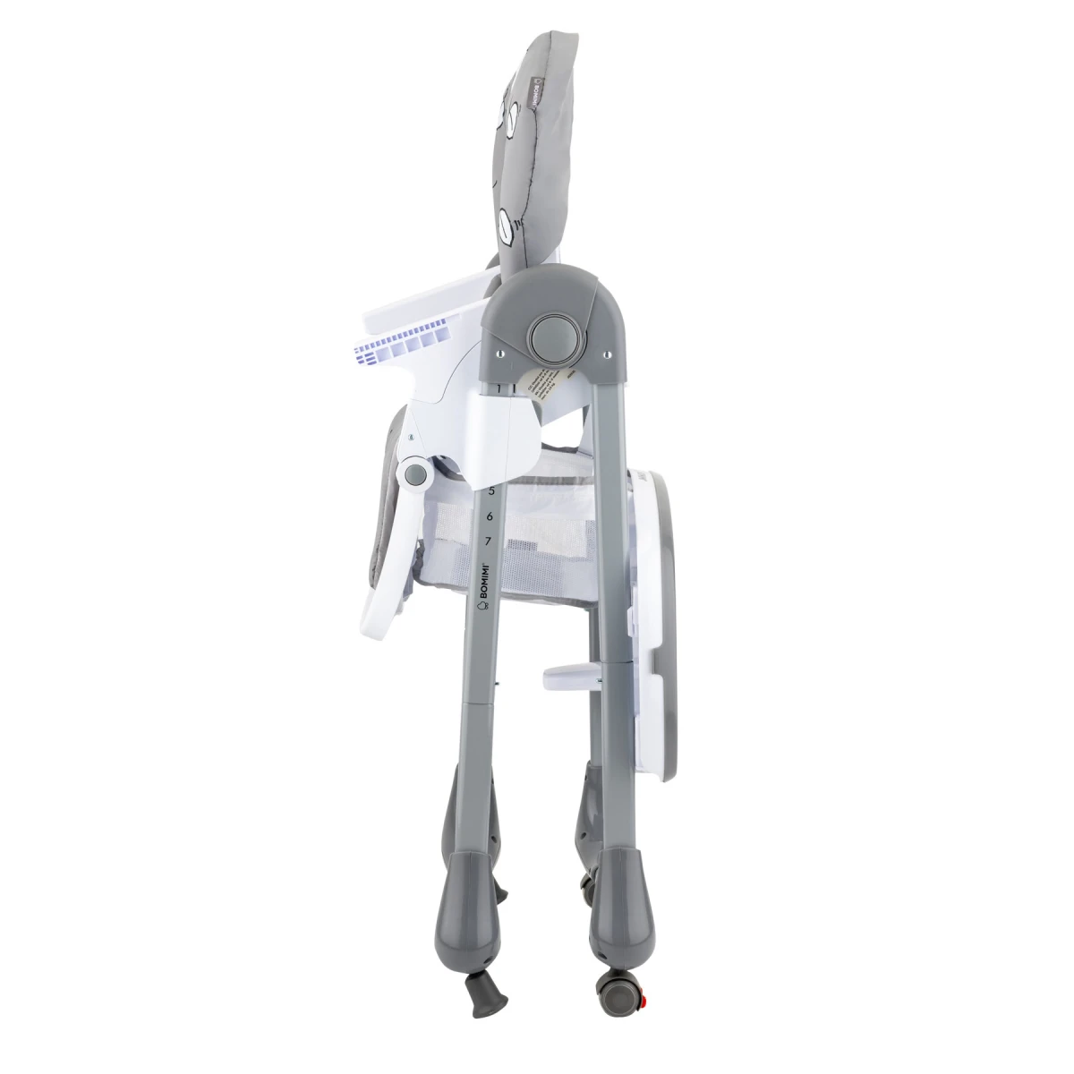 Tácku je možné nastaviť do 3 polôh av prípade, že ju práve nevyužívate, ju jednoducho zavesíte na zadné nohy konštrukcie. Široká opierka chrbta poskytuje dostatok pohodlia a je nastaviteľná do 3 polôh, pričom celkovú výšku stoličky je možné polohovať až do 7 úrovní. Pre maximálny komfort dieťaťa je k dispozícii aj polohovateľná opierka nožičiek.