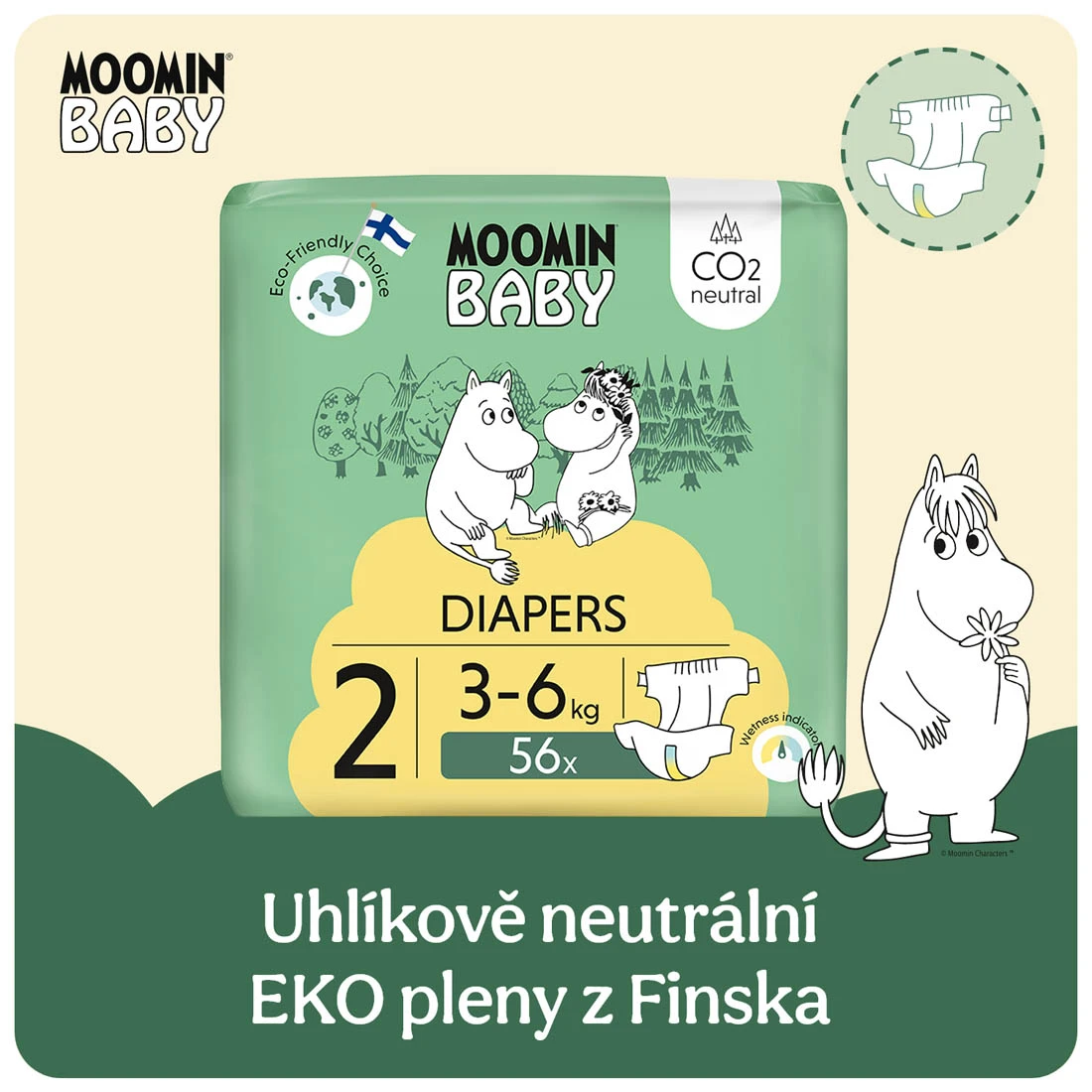Jednorazové eko plienky 2 Newborn 3–6 kg (168 ks), mesačné balenie eko plienok Moomin Baby