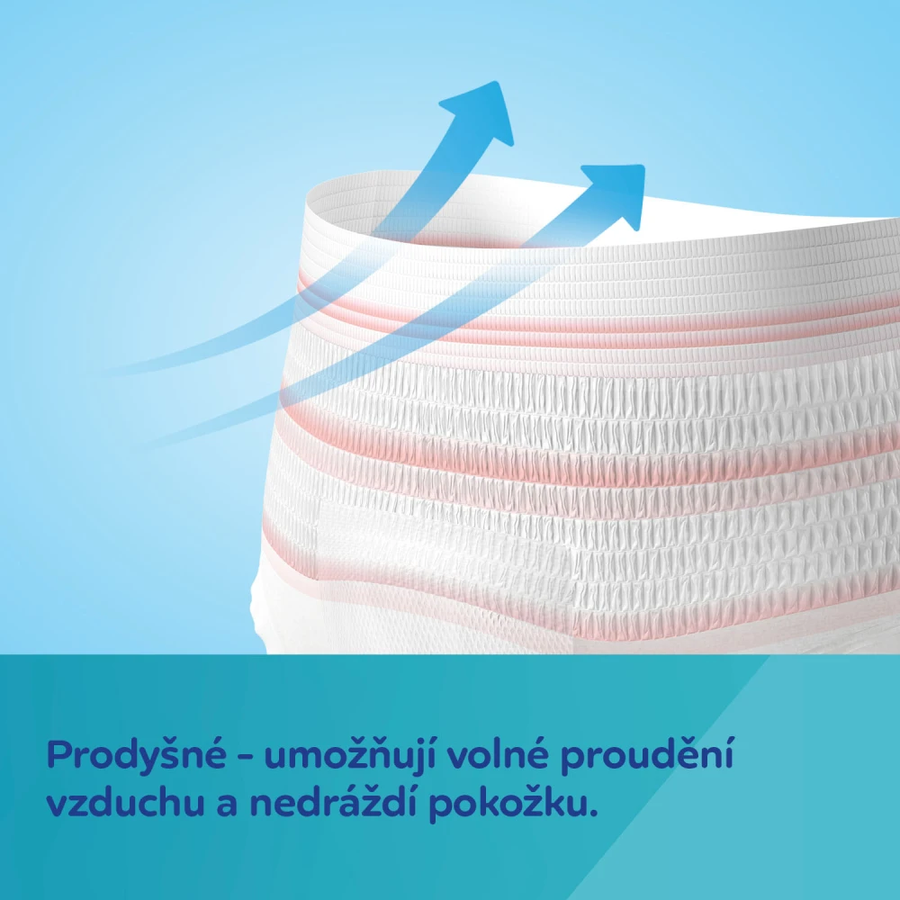 Nohavičky absorbujú až 400 ml tekutiny a poskytujú tak žiaduci pocit sucha. Pokročilá 360 ° ochrana proti úniku zaisťuje plnú ochranu zo všetkých strán, a to aj v ľahu. Priedušný dizajn umožňuje pokožke voľne dýchať, čím sa minimalizuje riziko podráždenia, zatiaľ čo výnimočne mäkká vnútorná vrstva je bezpečná aj pre tú najcitlivejšiu pokožku.