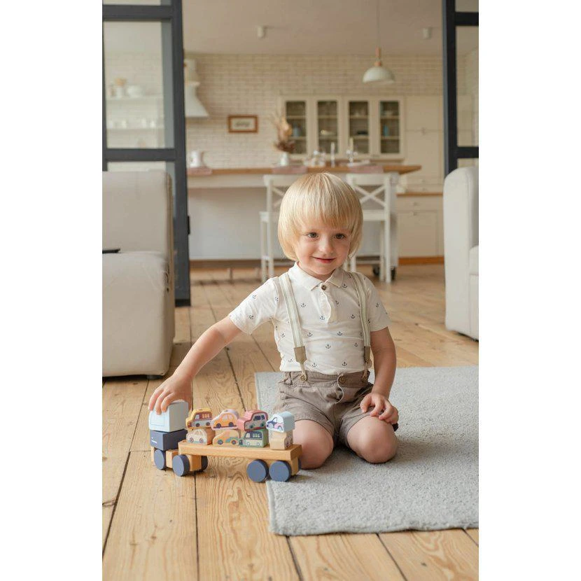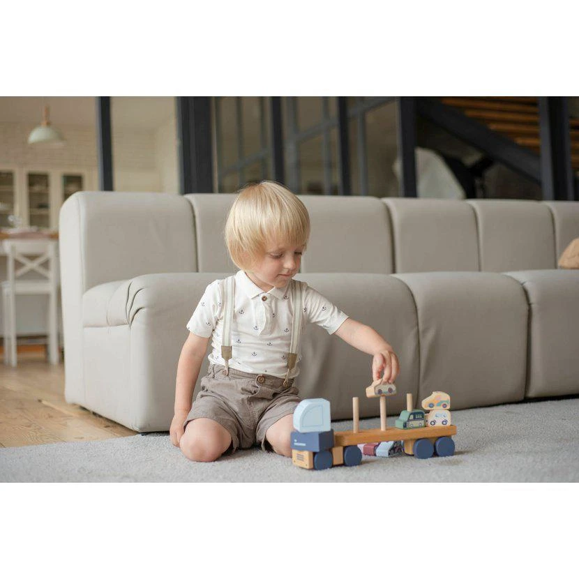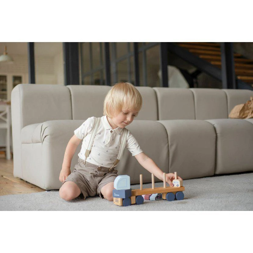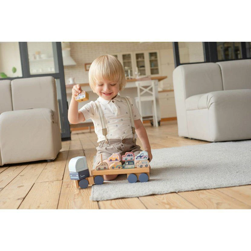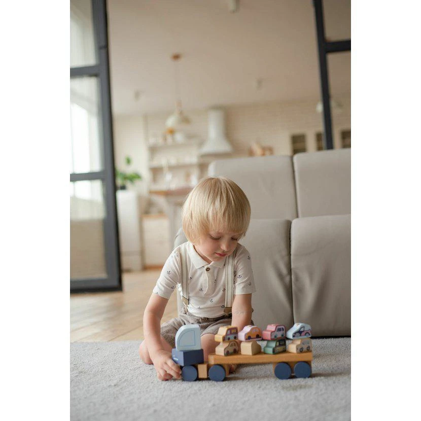 Kamión s autami je drevená skladačka s 12 farebnými dielmi, ktoré treba poskladať tak, aby kamión mohol hromadne prepravovať všetkých 8 autíčok.
