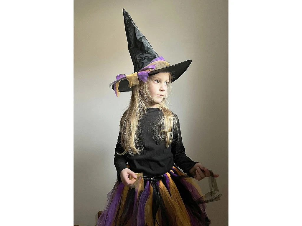 Detský čarodejnícky karnevalový kostým sa skladá z klobúka a tylovej sukne. Klobúk dobre drží tvar a je ozdobený tylom.