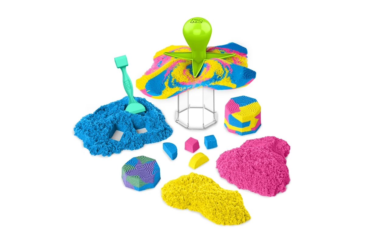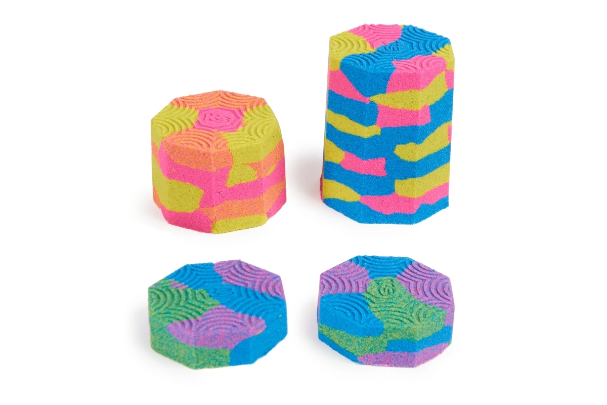 Táto sada obsahuje 130 g žltého, ružového a modrého kinetického piesku, 5 formičiek a nástrojov, s ktorými môžeš vrstviť, stláčať, krájať a tvoriť.