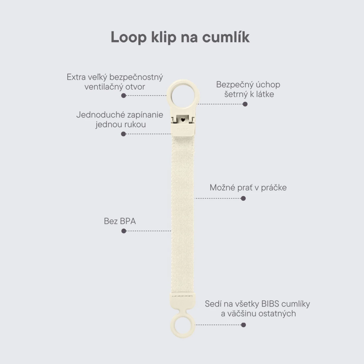 Klip na cumlík BIBS Loop je praktickým pomocníkom, ktorý nájde využitie doma, vonku, v autosedačke aj pri prechádzkach . Zaisťuje, že cumlík zostane vždy po ruke, nespadne na zem a nestratí sa.