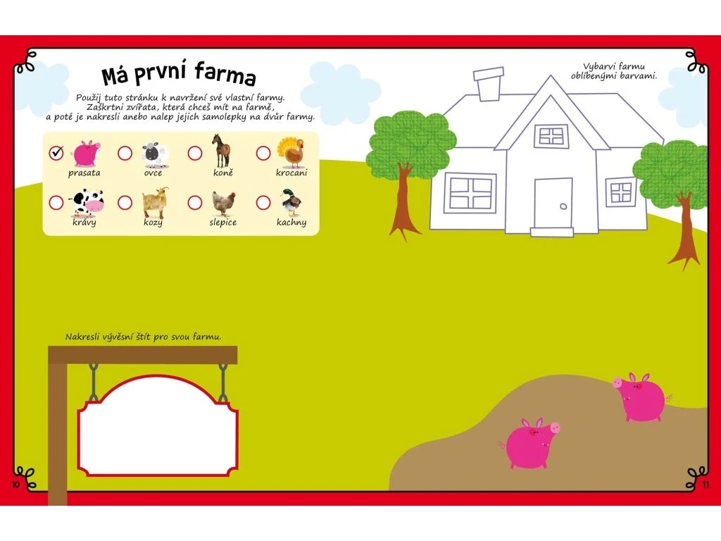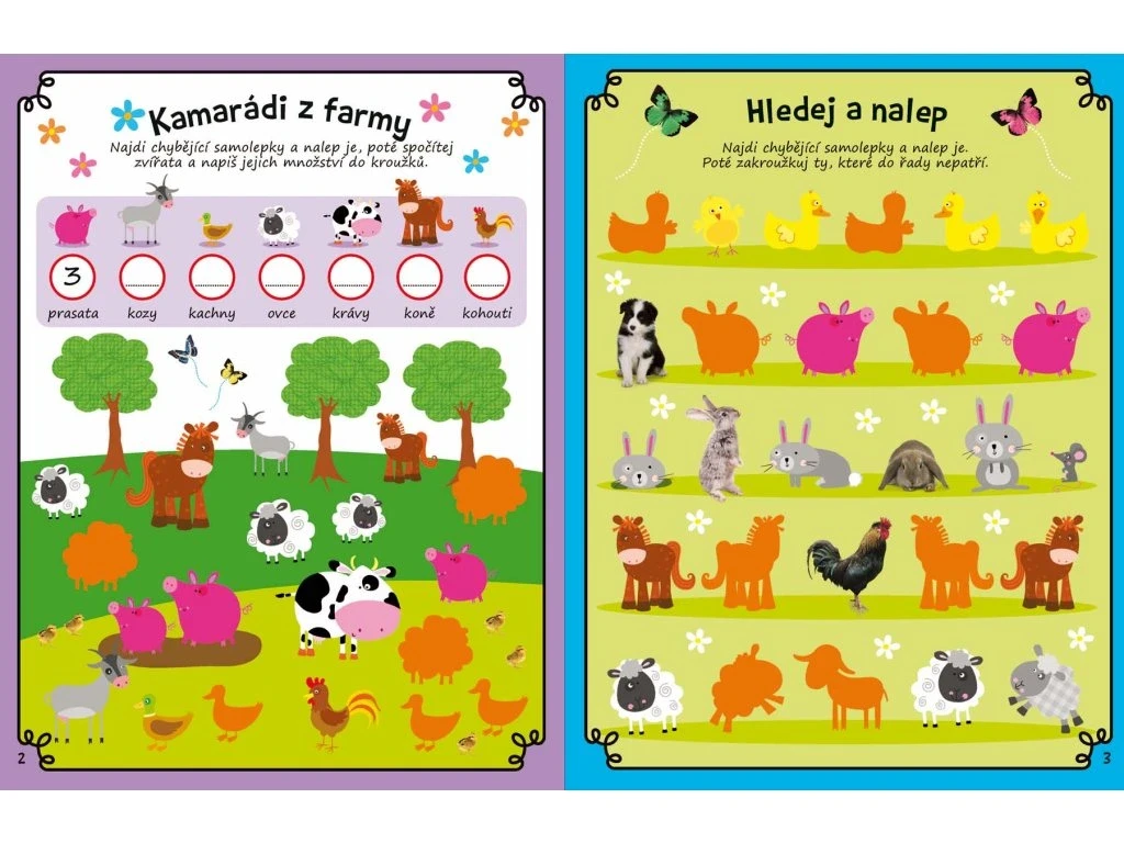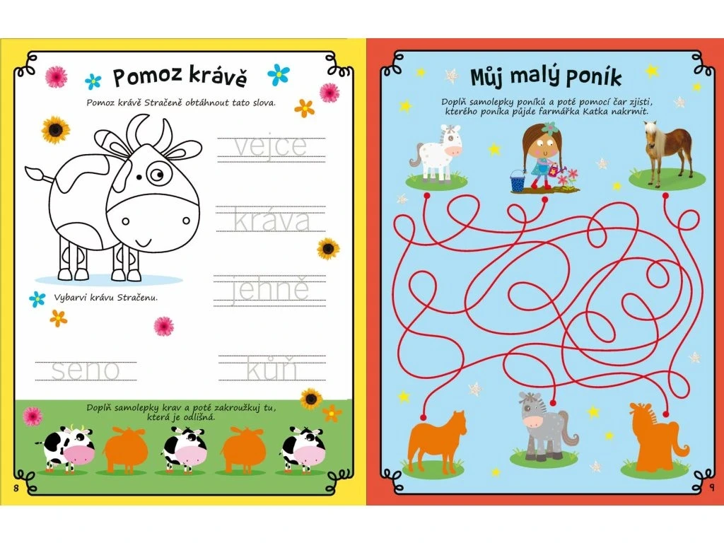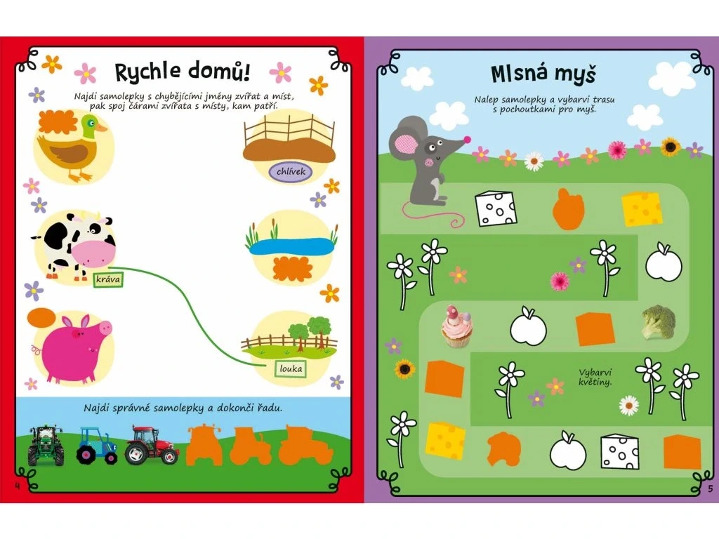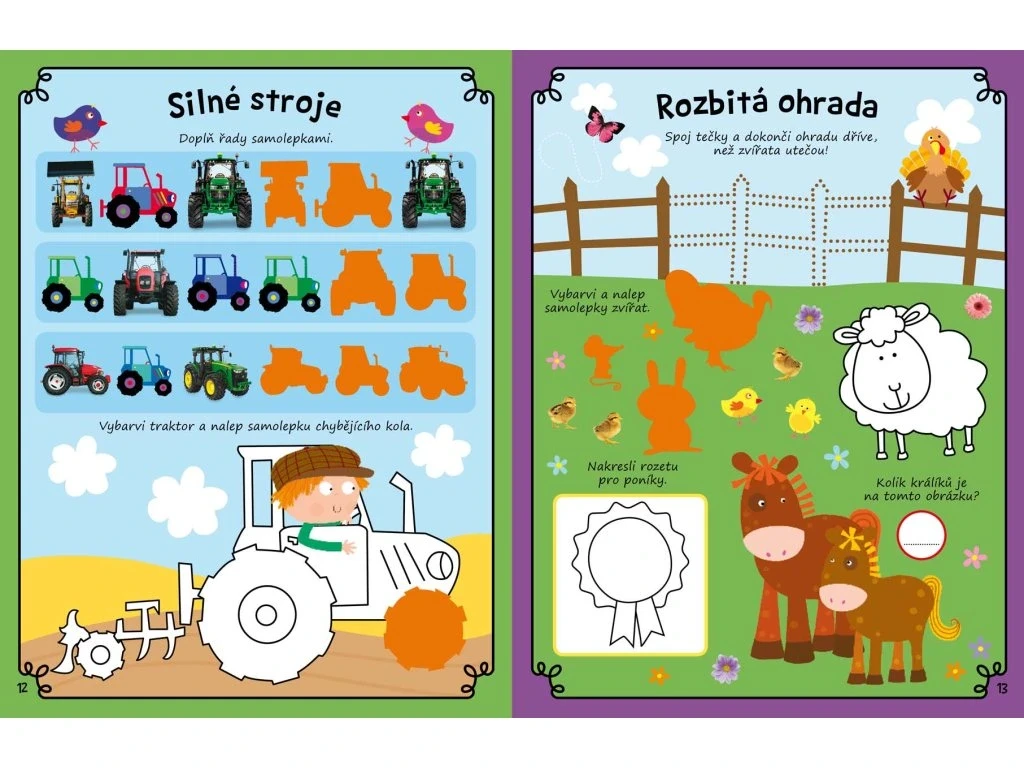 Spoj bodky a dokonči ohradu skôr, ako ti zvieratá utečú! Vyfarbi traktor a nalep samolepku chýbajúceho kolesa! Vieš spočítať králiky na tomto obrázku? Nakresli za pomoci mriežky koňa podľa predlohy... Uži si skvelú zábavu pri mnohých úlohách spojených s vyfarbovaním, doplňovaním a nalepovaním viac ako 1000 samolepiek do tejto knižky, plnej traktorov a zvieratiek z farmy, ktoré si môžeš nalepiť buď priamo do tejto knihy, alebo kamkoľvek budeš chcieť!