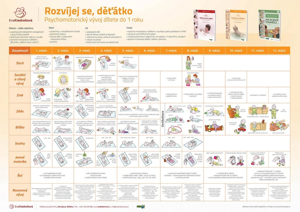 Rozvíjaj sa, dieťatko... - Eva Kiedroňová. Táto publikácia je zameraná na všestranný psychomotorický vývoj dieťaťa do jedného roka. Psychomotorický vývoj dieťaťa sa týka pohybového vývoja celého tela, čiže hrubej motoriky, rozvoja zručností rúk, alebo jemnej motoriky, ktorá súvisí s rozumovým vývojom a rozvojom zmyslov ako je zrak, sluch, reč, čuch a hmat.