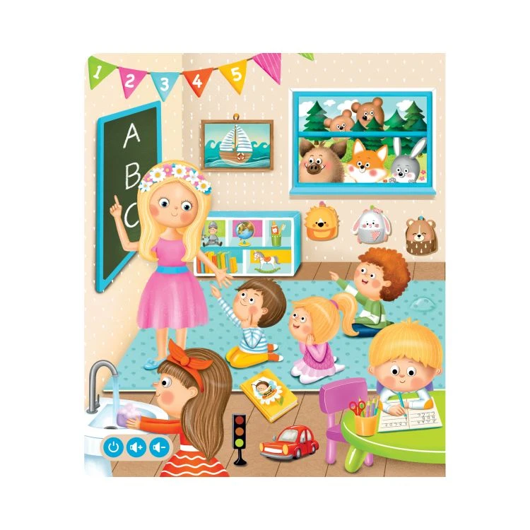 Hovoriaca kniha je určená pre najmenšie deti od 3 rokov, ktoré sa spolu s postavami pozrú napr. do škôlky, kde sa naučia prvé písmenká, čísla aj farby. V parku pri rybníku nakŕmia kačice a zahrajú sa na ihrisku. V rozprávkovom lese pomôžu kozliatkam a nenaletí vlkovi. Pozrú sa aj do divadla, kde spoznajú hudobné nástroje. Dozvie sa, kto žije pod zemou a čo zdravého rastie na záhrade. Čaká ich aj výlet späť v čase, keď stretnú dinosaurami, v telocvični si zašportujú a nakoniec navštívia farmu so zvieratkami.