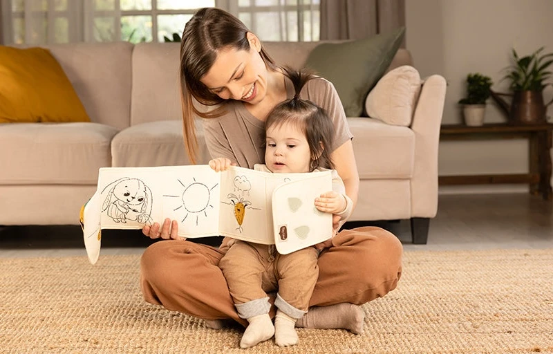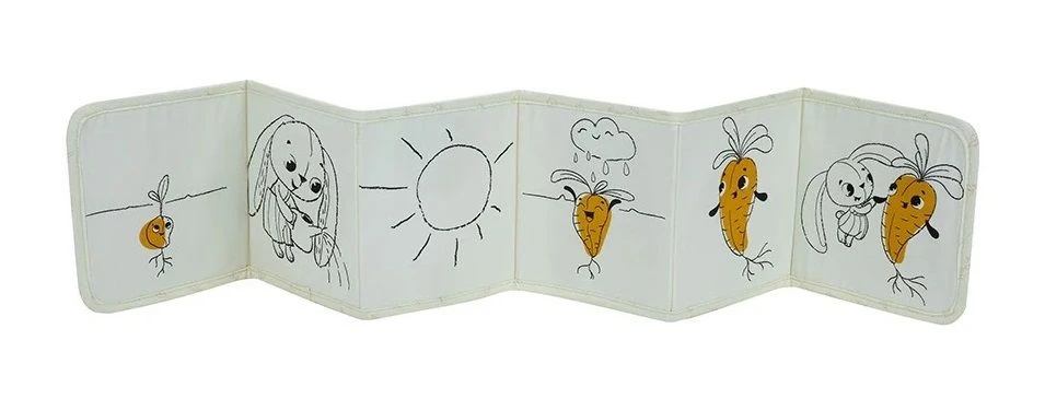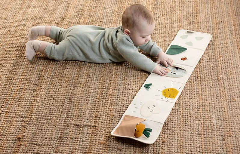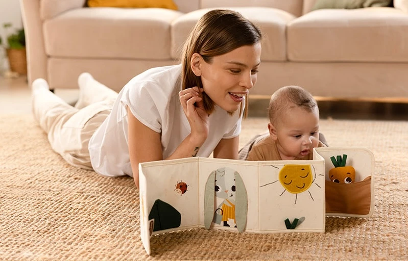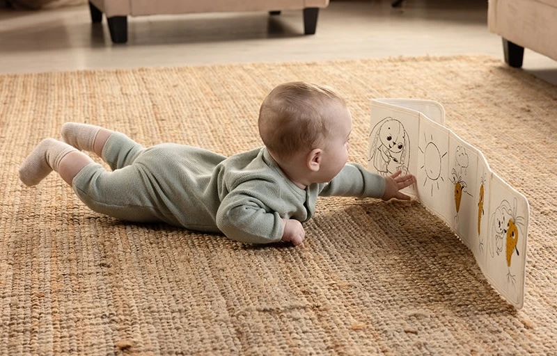 Od 3 mesiacov: strana s farebnými obrázkami a rôznorodými textúrami na skúmanie, ktoré podporujú rozvoj zmyslov a jemnej motoriky dieťaťa.