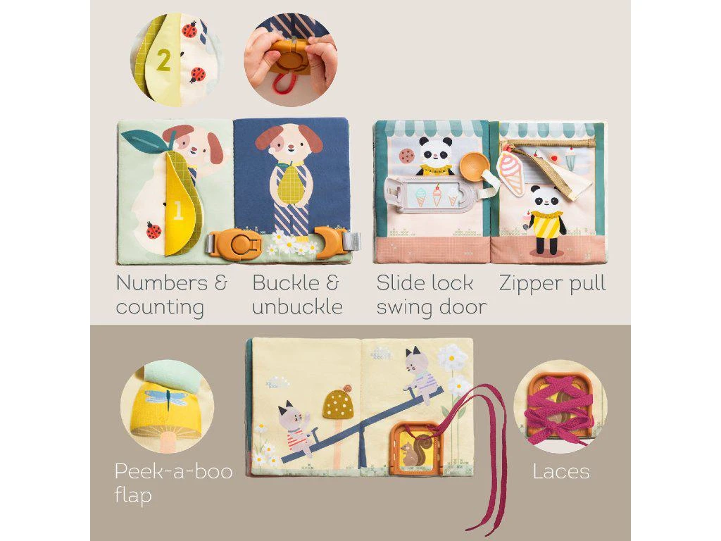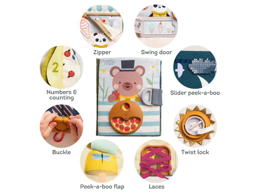 15 interaktívnych aktivít - zipsy, pracky, šnúrky alebo schovávačky - všetko, čo malé ručičky potrebujú na precvičenie zručností ako je zapínanie, viazanie a obliekanie. Praktická na cesty - ľahká a kompaktná, zabaví dieťa kedykoľvek a kdekoľvek, ideálna do auta, do kočíka alebo na návštevu.