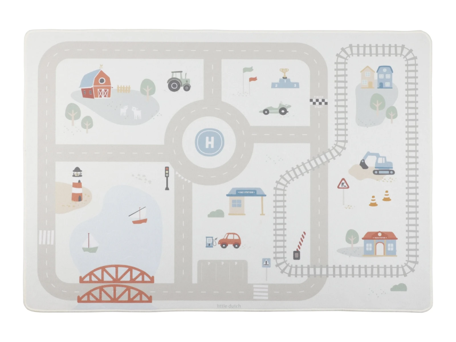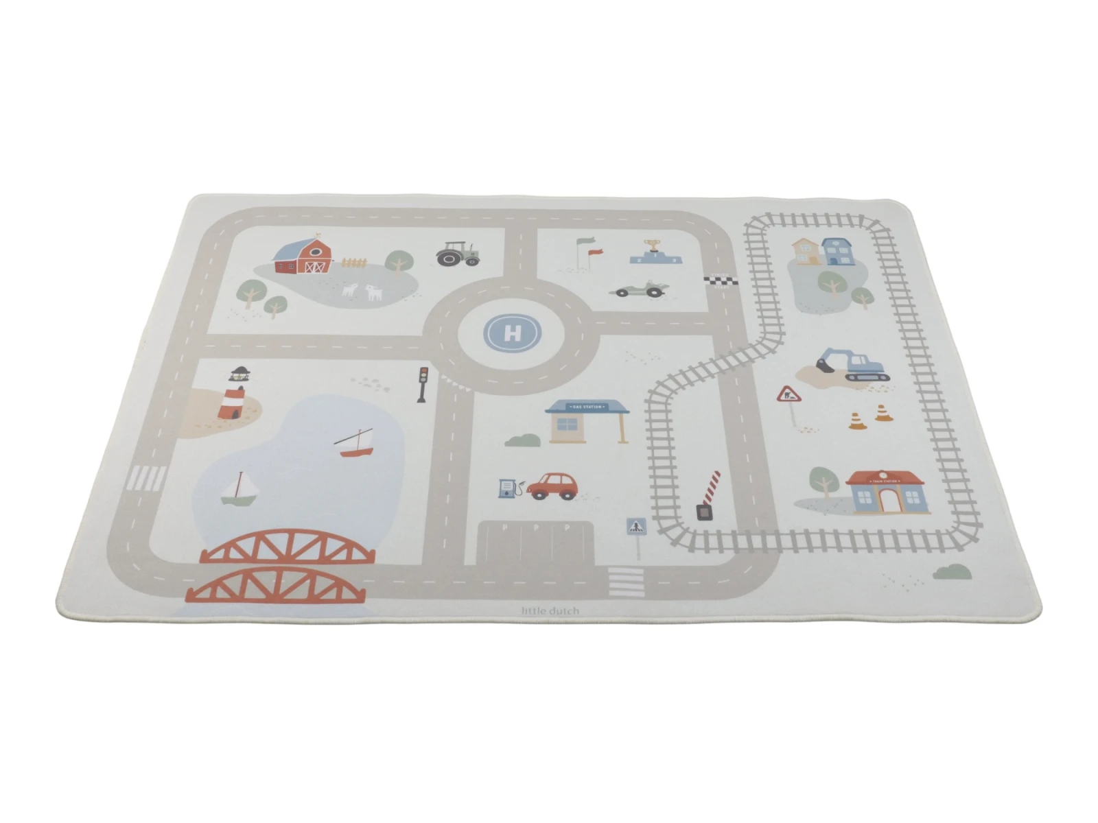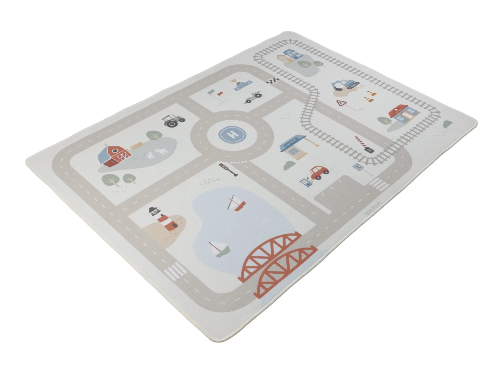 Detský koberec Little Dutch premení podlahu v detskej izbe na živý svet plný ciest, zákrut a križovatiek, kde sa príbehy tvoria samé. Deti môžu parkovať autá do garáže, prechádzať mestom alebo sa vydať na cestu vlakom – design koberca ich prirodzene vedie a podporuje fantáziu aj sústredenú hru.