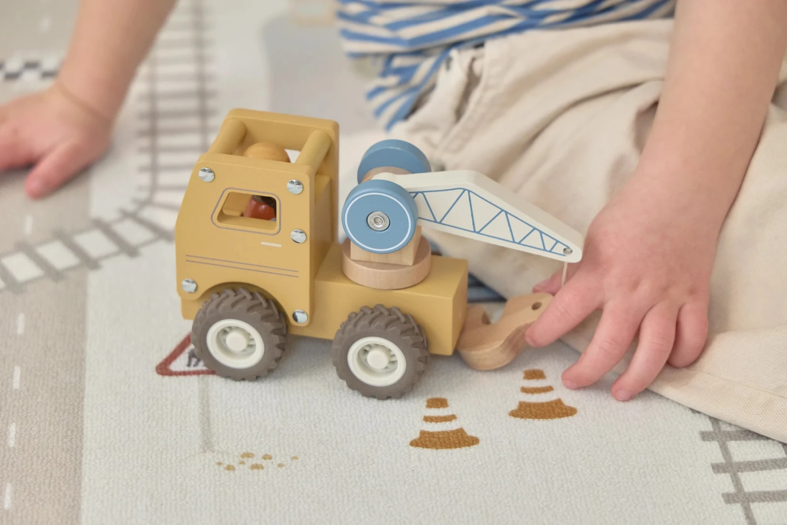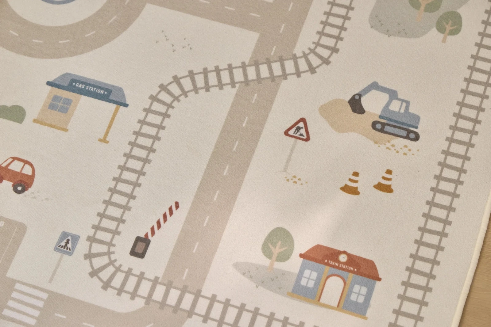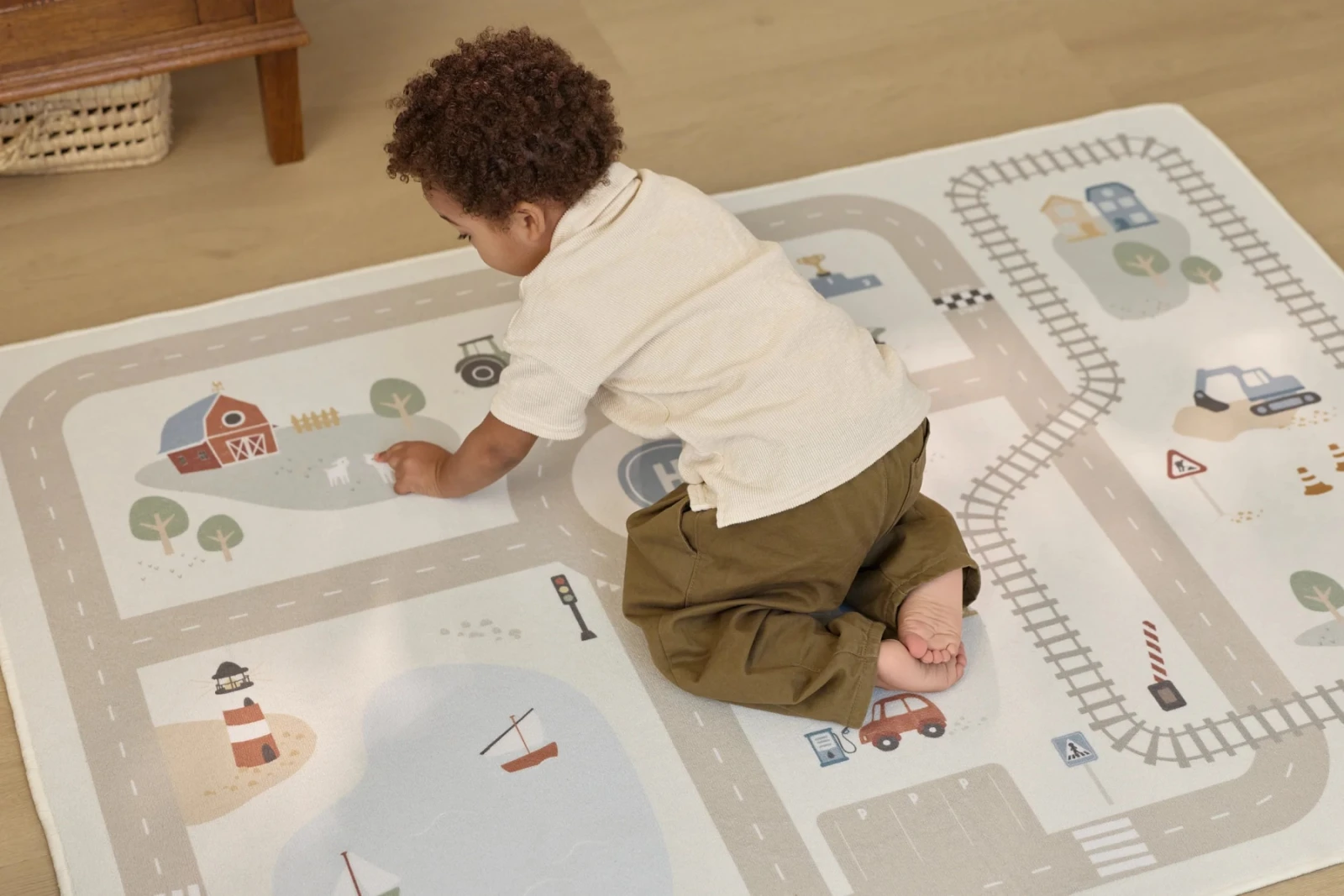 Detský koberec Little Dutch premení podlahu v detskej izbe na živý svet plný ciest, zákrut a križovatiek, kde sa príbehy tvoria samé. Deti môžu parkovať autá do garáže, prechádzať mestom alebo sa vydať na cestu vlakom – design koberca ich prirodzene vedie a podporuje fantáziu aj sústredenú hru.