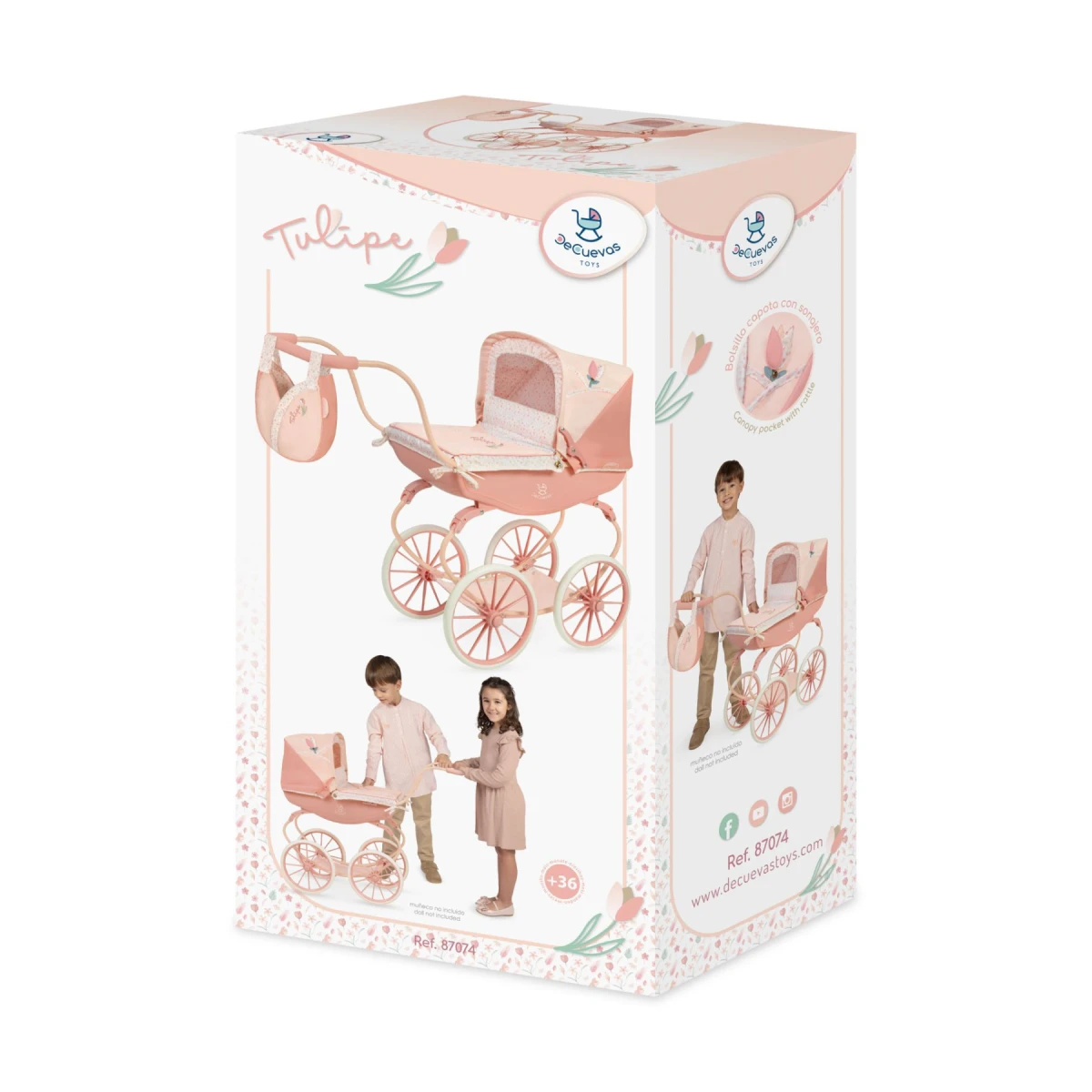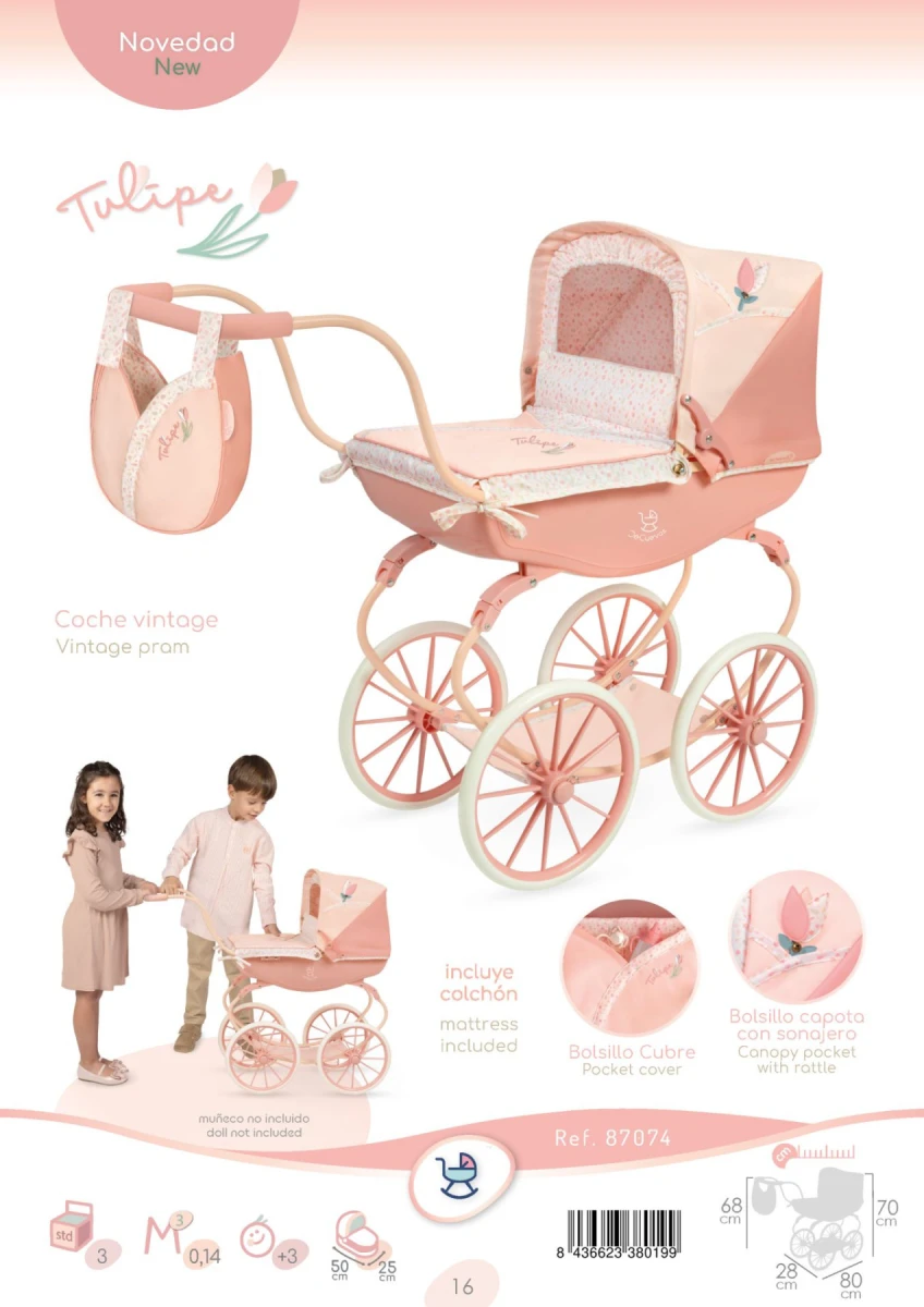DeCuevas Kočík pre bábiky hlboký Tulipe 2025 - 68 cm patrí do rovnomennej kolekcie, ktorá je novinkou roku 2025 a ponúka výber výrobkov od jedálenských sád cez postieľky a kočíky až po drevený nábytok pre bábiky.
