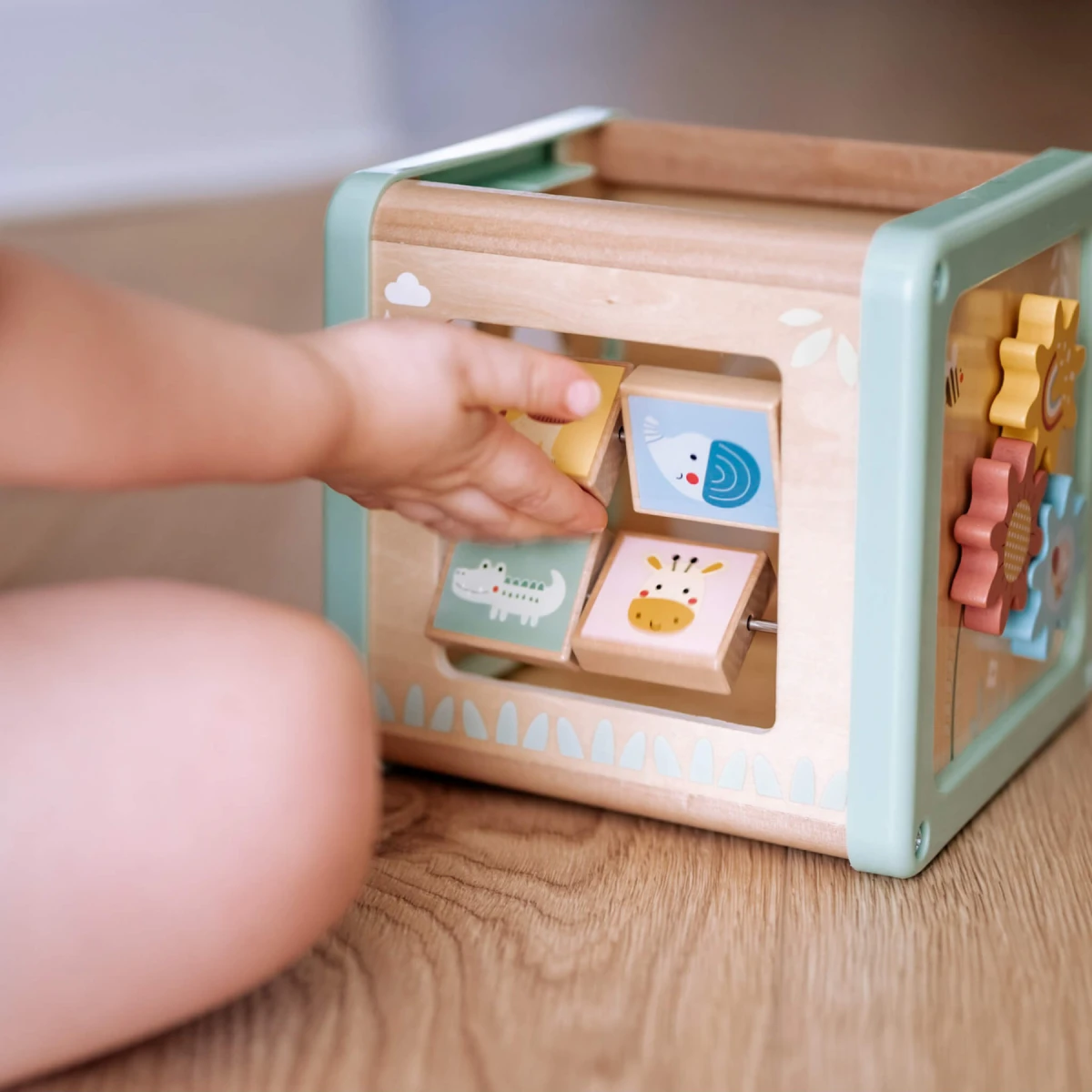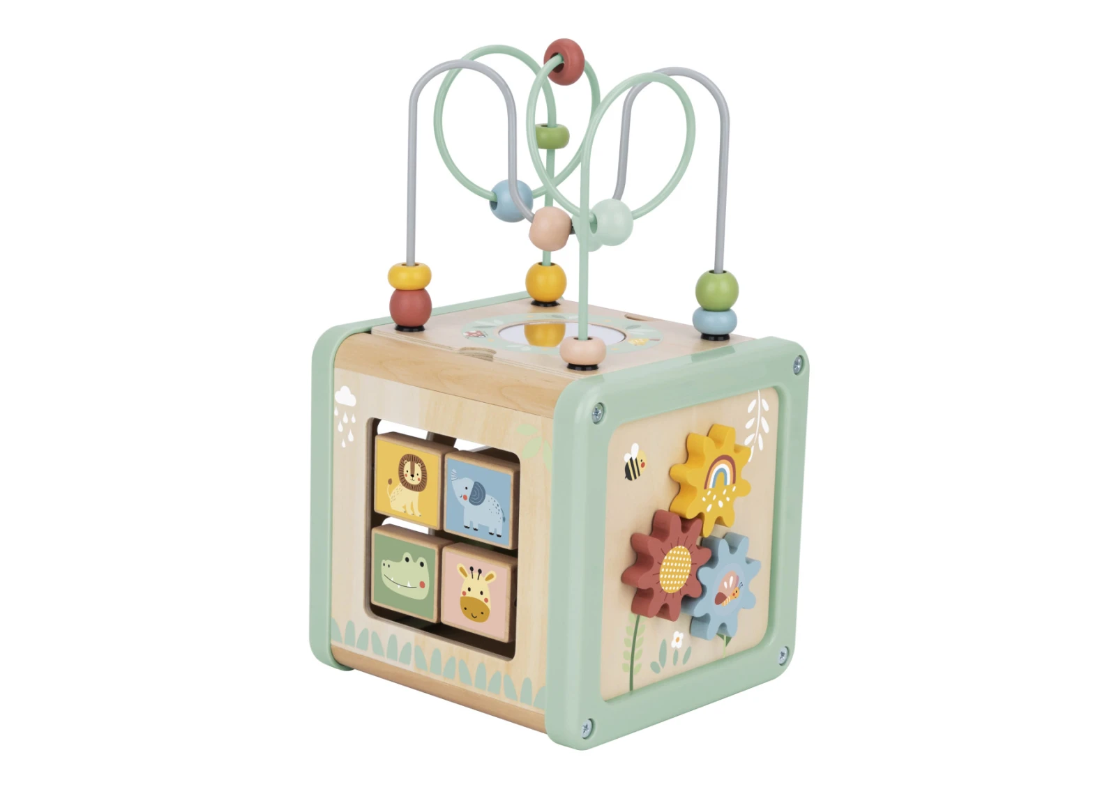 Krásna drevená aktivity kocka s lúčnymi motívmi v nežných pastelových farbách od Tooky Toy sa stane zdrojom zmysluplnej zábavy pre vaše batoľatá.