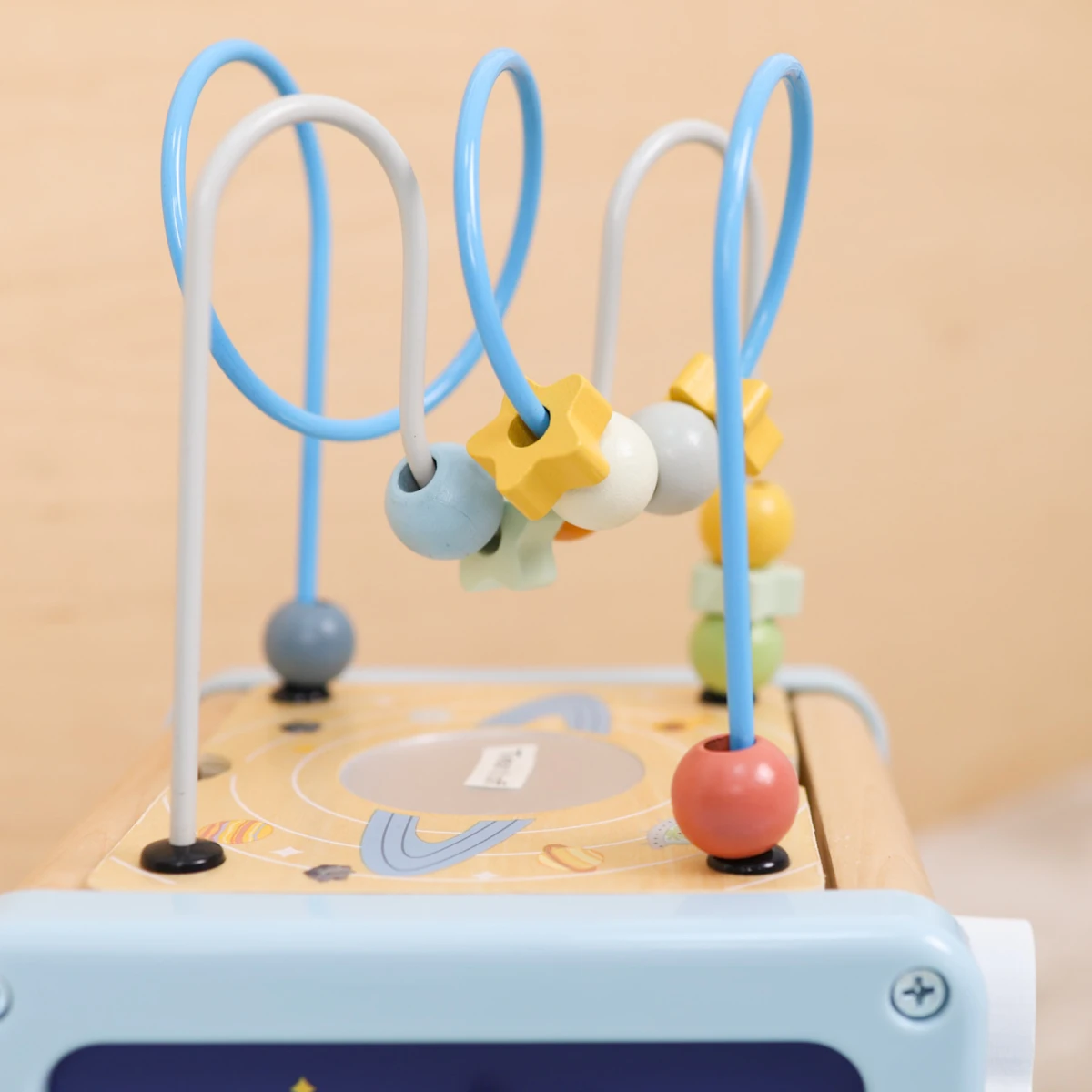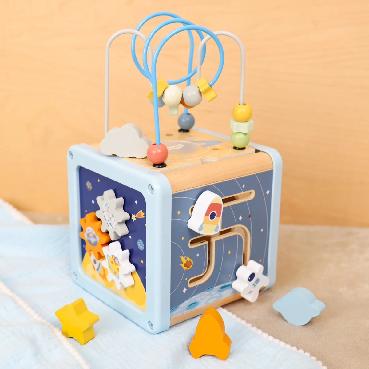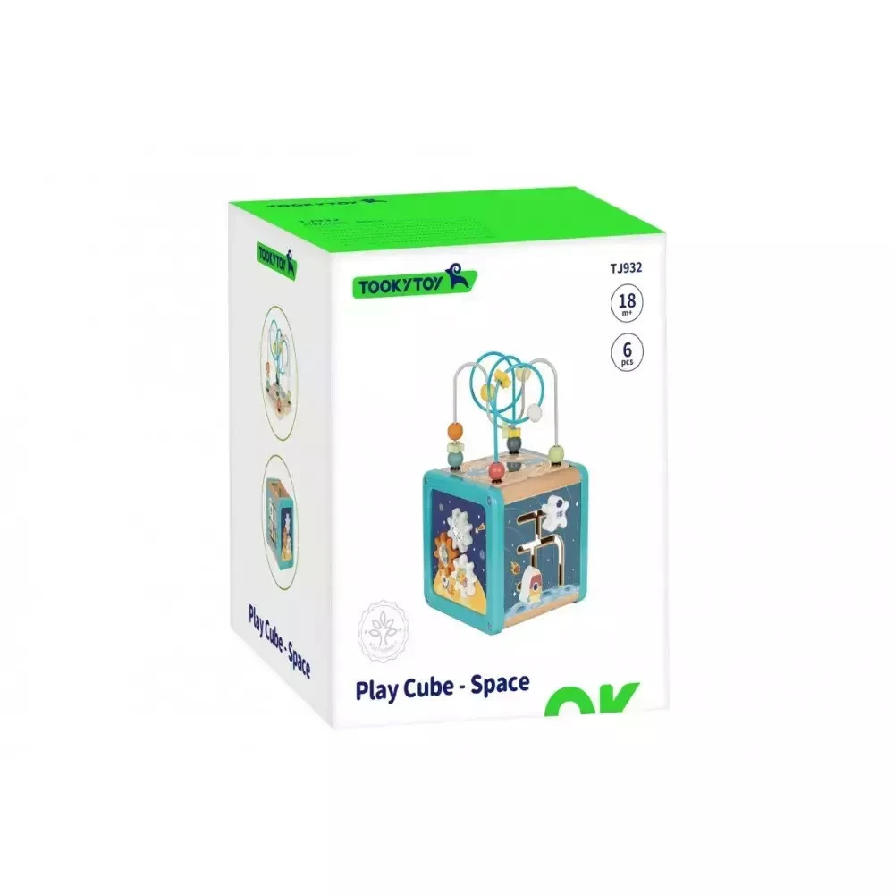 Mini galaxia zábavy na podlahe - 5 aktivít v jednej kocke. Začnite objavovanie vesmíru spolu s vašim batoľaťom – táto hravá drevená kocka od značky Tooky Toy ponúka päť rôznorodých motorických hier.