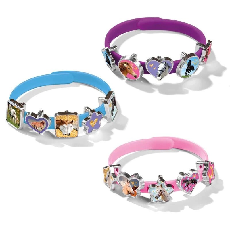 Balenie obsahuje: tri plastové náramky farby ružovej, modrej, fialovej a 18 rôznych druhov doplnkov s motívom Koní.