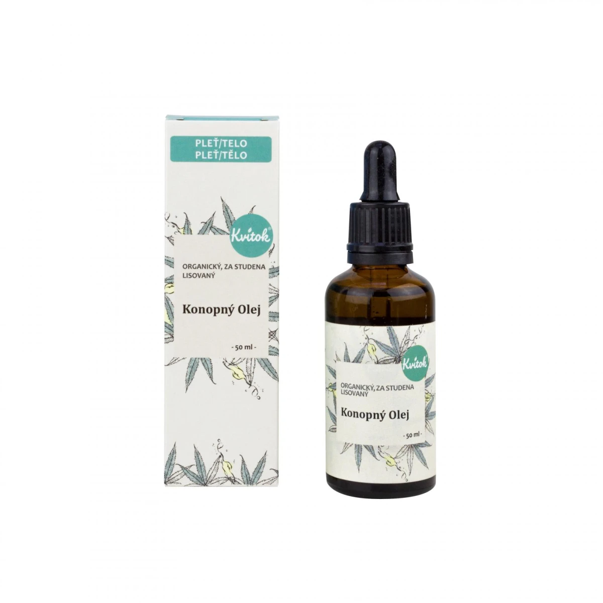 Konopný olej Kvitok v organickej kvalite je lisovaný za studena, nerafinovaný, s charakteristickou zemito bylinkovou vôňou. Zložením je veľmi blízky lipidovému plášťu kože. Pomáha zmierňovať prejavy atopického ekzému, psoriázy, mykózy zápalových procesov kože. Je vynikajúcim pomocníkom po opaľovaní , upokojuje spálenú pokožku. Stimuluje rast vlasov a pomáha pri problémoch s lupinami.