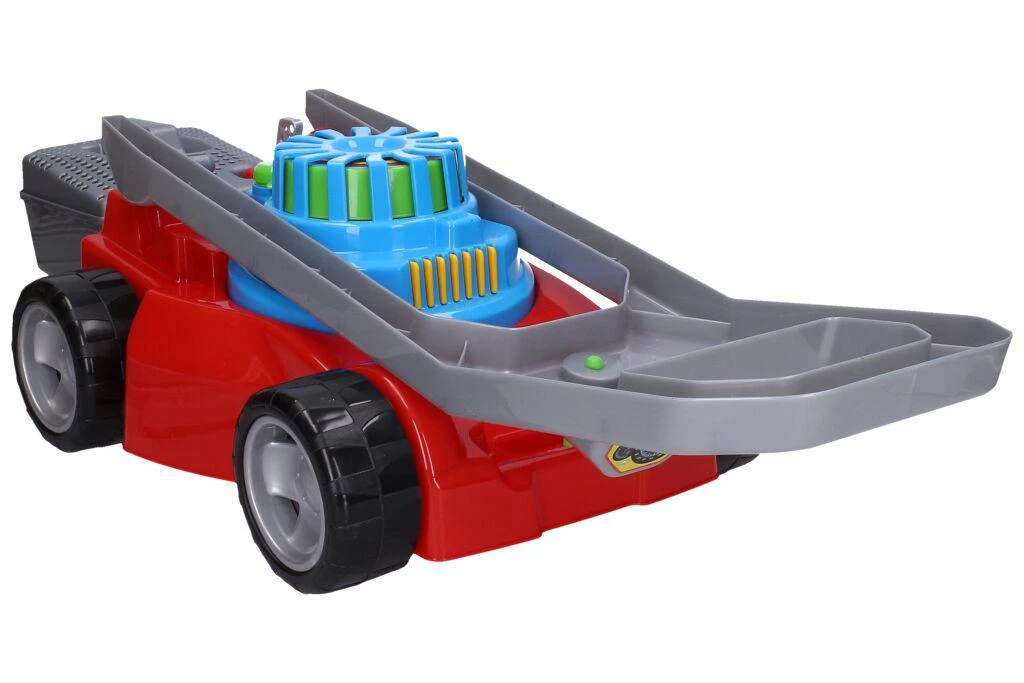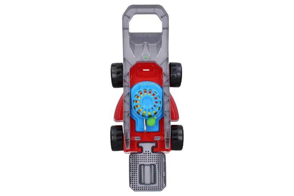 Predné kolieska sú voľné, zadné kolieska pri jazde cvakajú. V rukoväti je cvakajúci otočný spínač. Uprostred kosačky je farebná rotujúca špirála, ktorá sa roztáča vytiahnutím, alebo zasunutím páčky.
