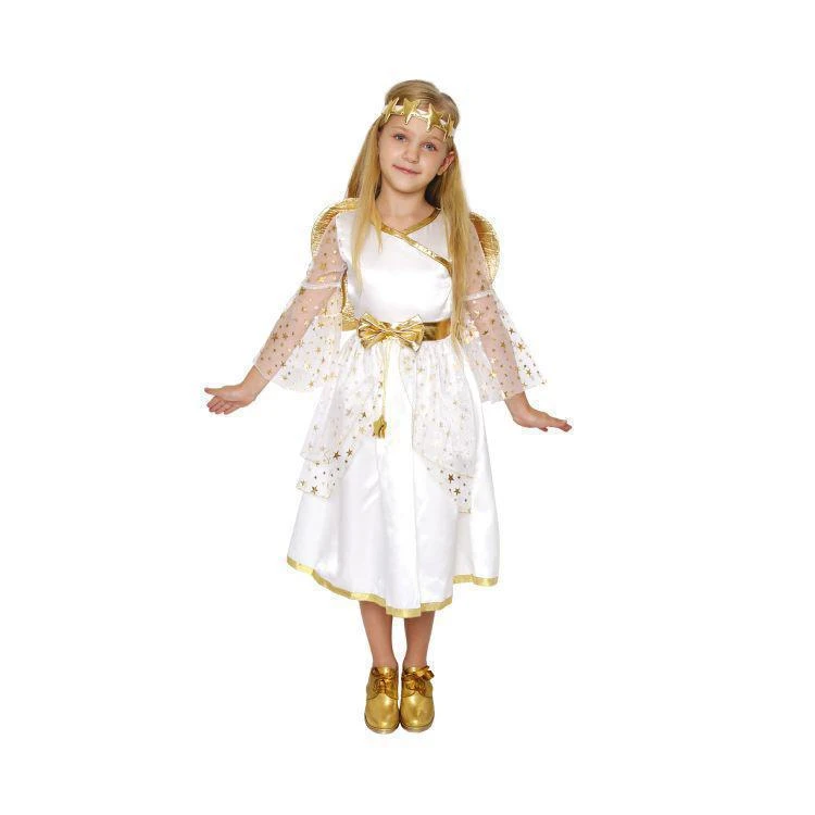 Anjelský kostým dopĺňajú čelenka s hviezdnou aplikáciou a zlaté krídla, ktoré sa pripínajú pomocou suchého zipsu v zadnej časti šiat.