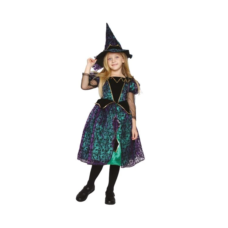 Detský kostým čarodejnice so zeleno-čiernymi šatami vo veľkosti 7-9 rokov je skvelou voľbou na karneval, Halloween alebo pálenie čarodejníc.