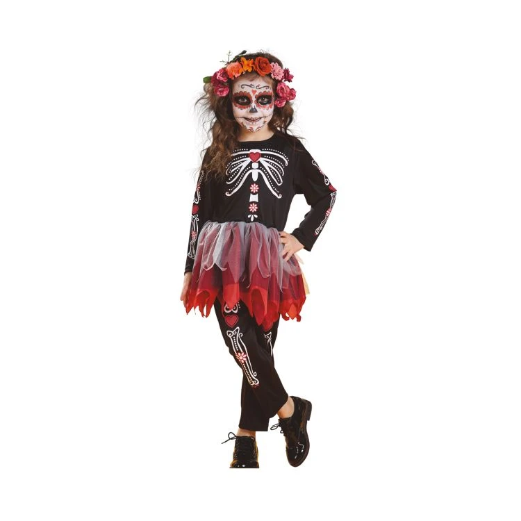 Kostým je ladený do čiernej, červenej a bielej farby a zahŕňa overal s potlačou kostry a srdiečok, doplnený všitou vrstvenou sukňou. Overal sa zapína vzadu na suchý zips.