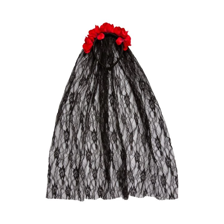 Tento kostým dopĺňa čelenka zdobená červenými kvetmi s čiernym závojom.