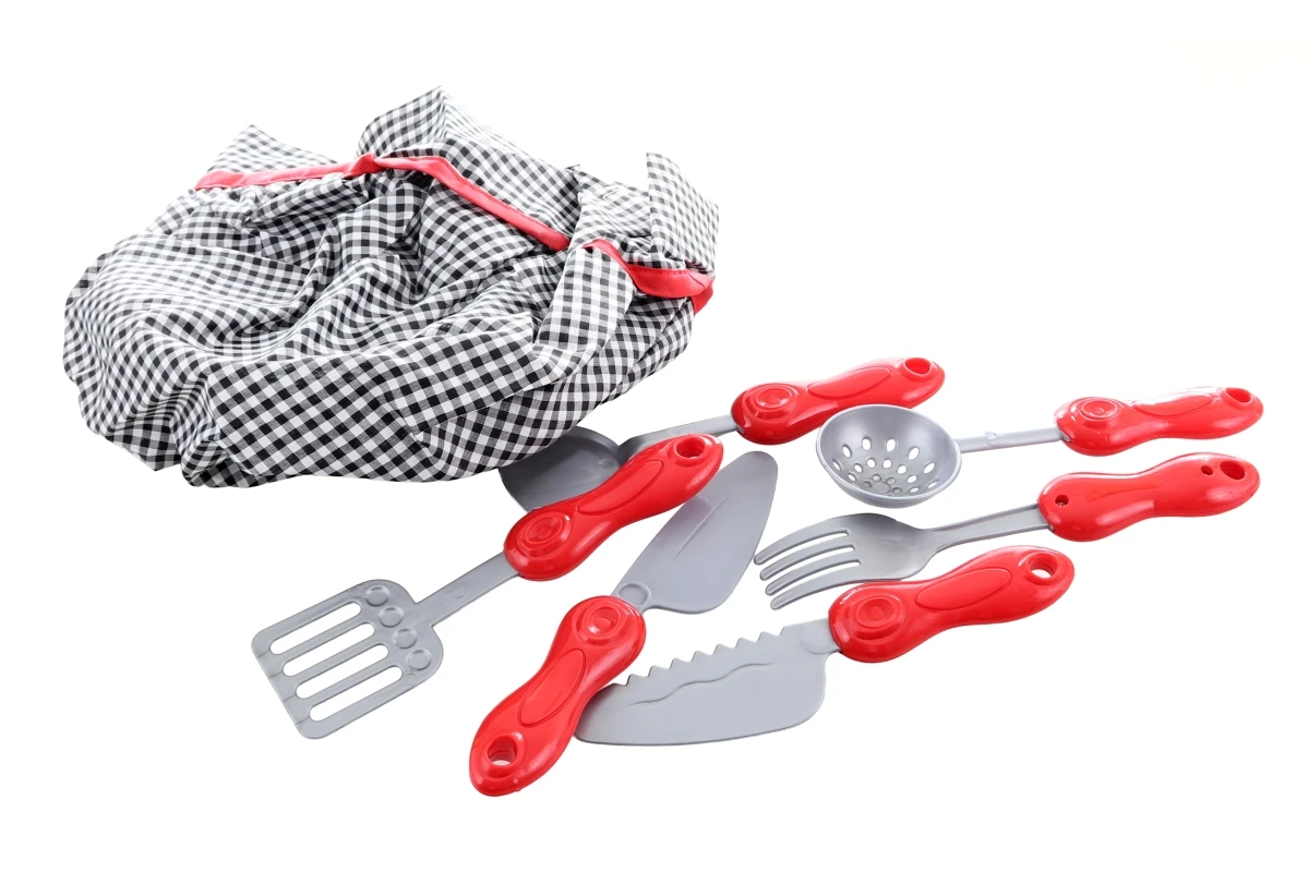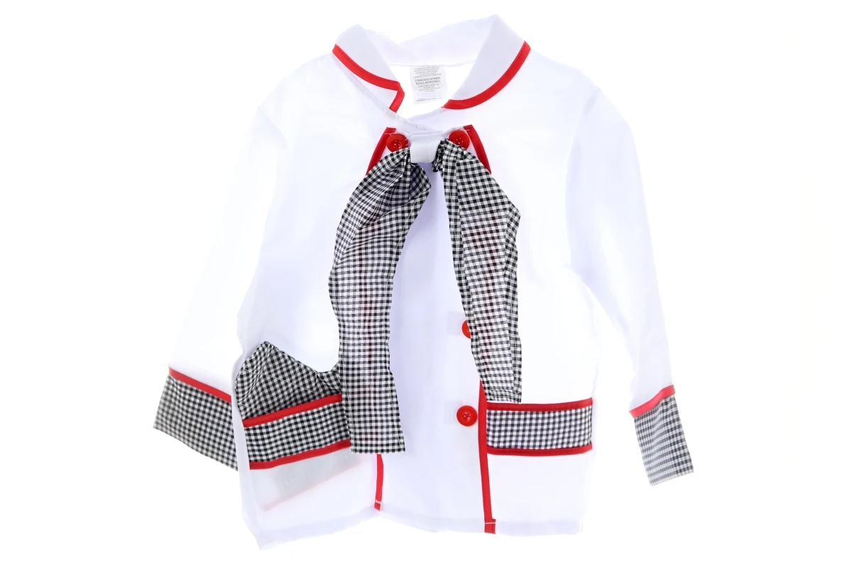 Obsah balenia: kuchársky kabátik, kuchynská rukavice, kuchárska čiapka a sada riadu