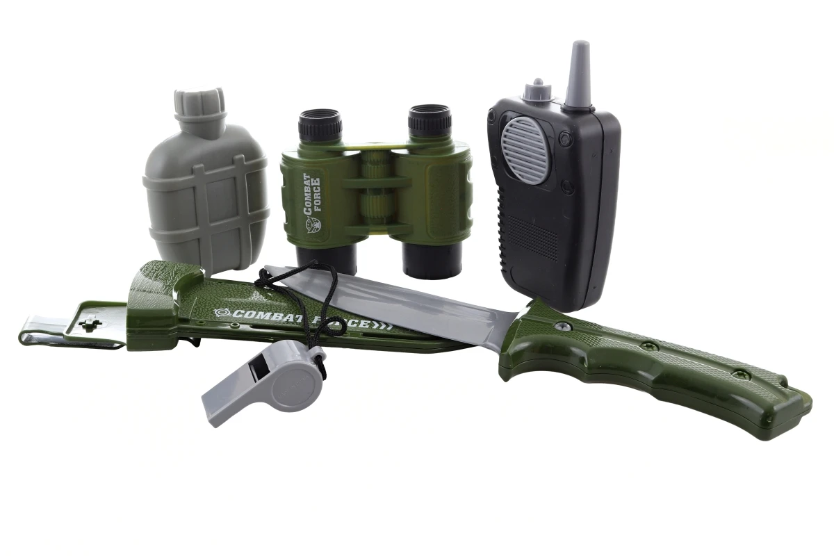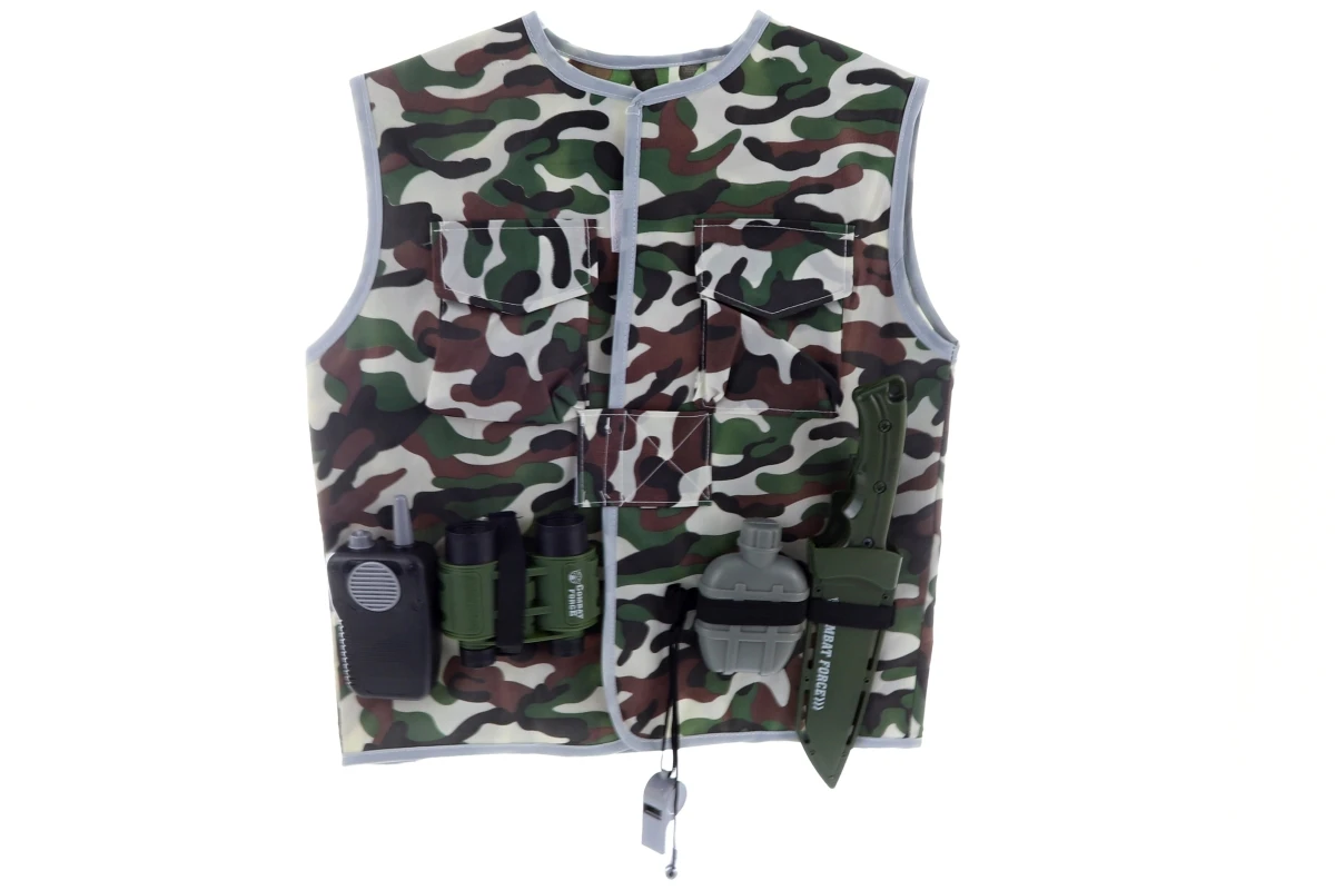 Obsah balenia: vesta, vysielačka, ďalekohľad, fľaša, píšťalka a nôž v puzdre (čepeľ je mäkká a ohybná pre bezpečnú hru)