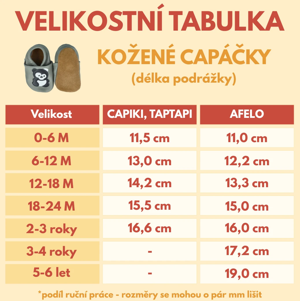 Vyrobené z nezávadnej kože v rovnakej fabrike, ako sa vyrábajú capáčky pre anglickú značku MiniFeet (sú teda rovnako šité); predstavujú bezkonkurenčný pomer kvality a ceny. Testované v českom laboratóriu a spĺňajú všetky európske normy pre deti do 3 rokov.