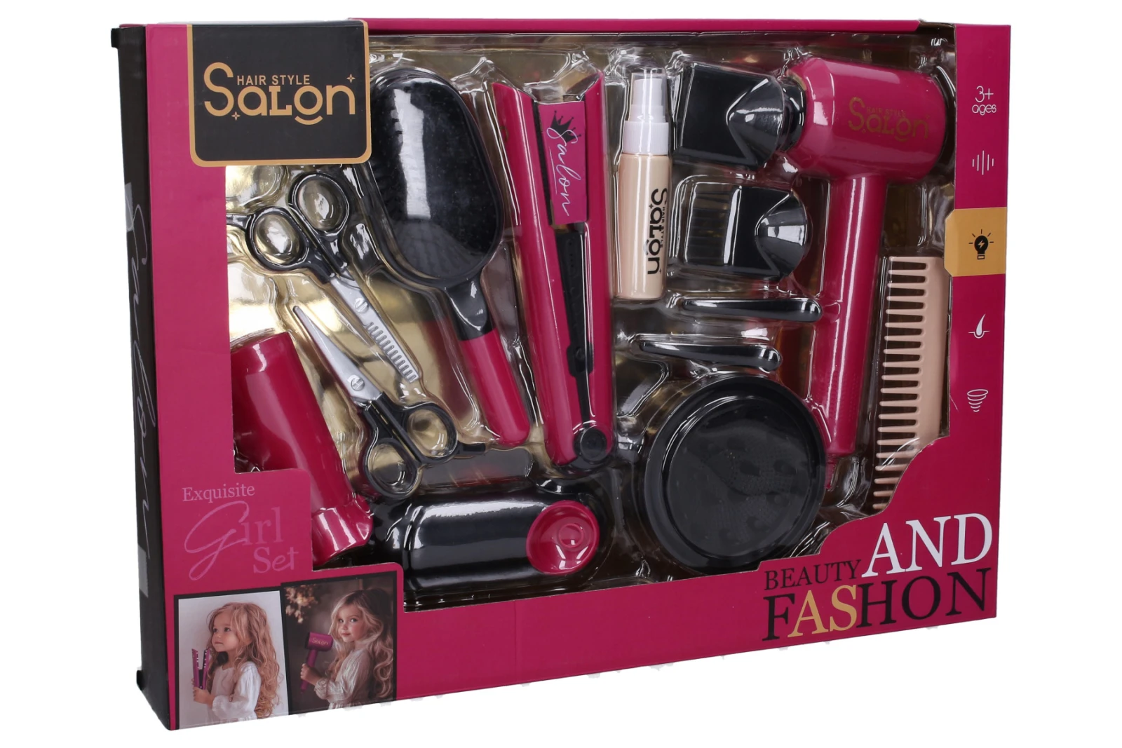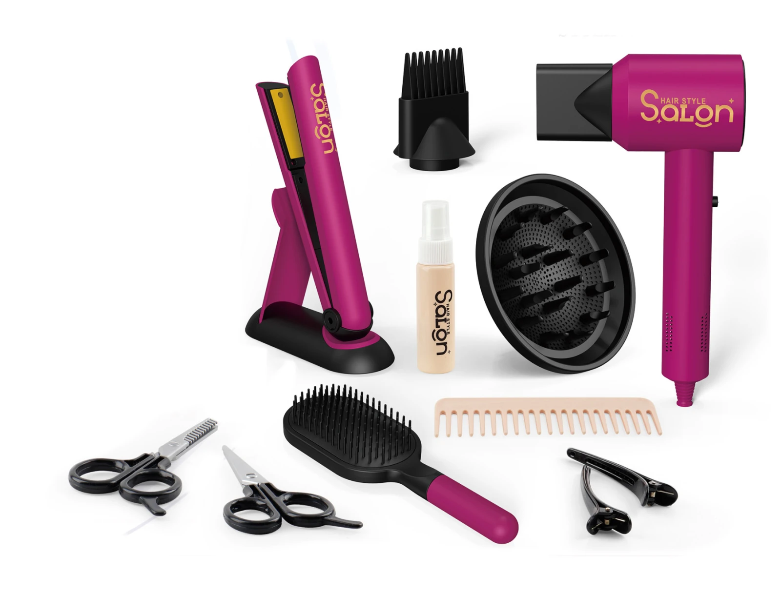 Kozmetický set s fénom a žehličkou umožňuje deťom napodobňovať starostlivosť o vlasy a rozvíjať svoju fantáziu pri tvorení vlastných účesov.