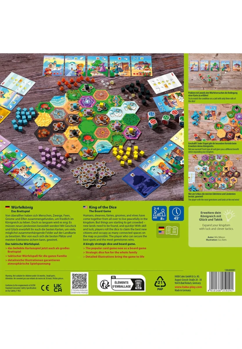 Taktická zábava s hádzaním kockami pre celú rodinu so stolnou hrou HABA Dice King: V kráľovstve sa situácia vyhrocuje. Táto rodinná hra pre deti od 8 rokov je vzrušujúcou variáciou populárnej kartovej hry HABA Dice King.