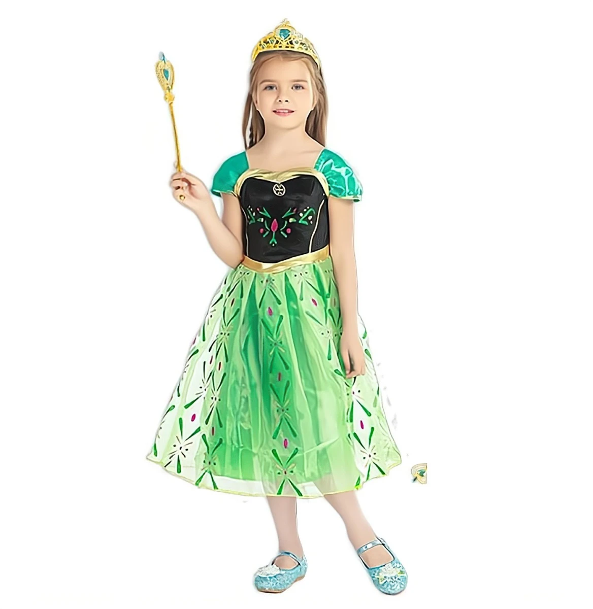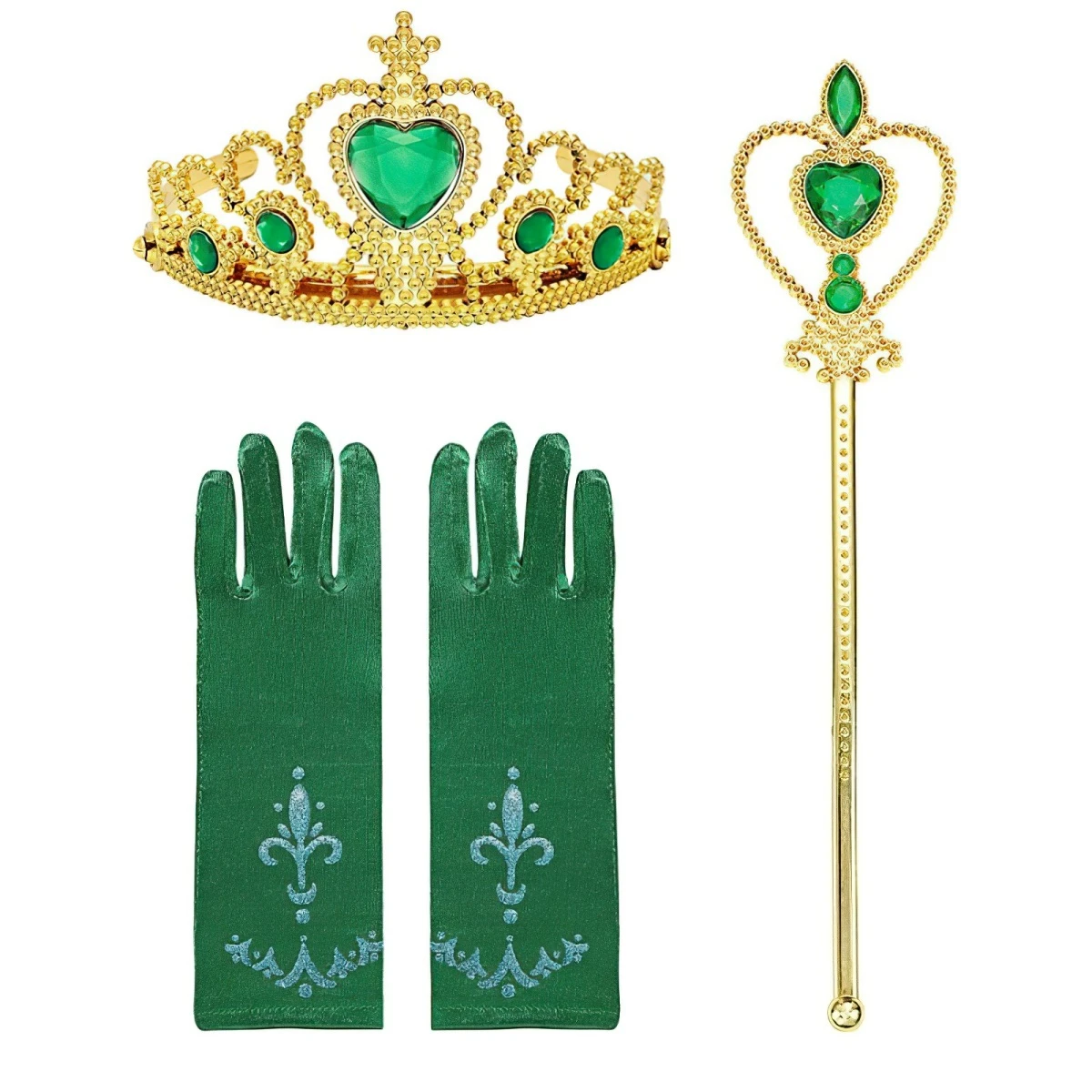 Sada obsahuje tri doplnky – zlatú korunku s tyrkysovými kamienkami, ladiacu kúzelnú paličku a zelené saténové rukavice s modrým vzorom. Zdobená korunka je vyrobená z ľahkého plastu a vďaka svojmu lesku a srdcovému kameňu uprostred pôsobí slávnostným a vznešeným dojmom. Je ideálny na detskú hlavu, ľahko sa nasadzuje a dobre drží počas hry aj pohybu. Zlaté žezlo s detailne prepracovanou rukoväťou a srdiečkom navrchu slúži ako perfektný doplnok k princeznovským roliam. Deti s ním môžu kúzliť a preniesť sa do rozprávkového sveta, kde hrdinka Anna bojuje za dobro, lásku a odvahu. Saténové rukavičky dotvárajú celý vzhľad a dodávajú štipku elegancie.