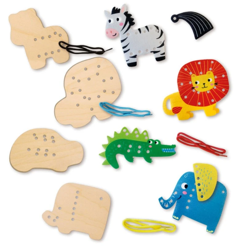 Drevené doštičky (základne): 4 doštičky s rôznymi tvarmi na navliekanie (slon, krokodíl, lev, zebra – alebo podobné motívy z džungle)