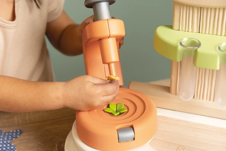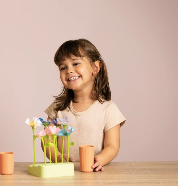Stačí vložiť dva rôzne lístky do stroja, pridať upevňovací dielik, stlačiť tlačidlo a kvet je hotový. Tú potom deti jednoducho nasadia na stonku a môžu vytvoriť celú kyticu podľa vlastnej fantázie. Hotové kvety je možné vystaviť do priloženého stojana, zabaliť do papierových kornútkov, ozdobiť samolepkami a „predávať“ ako v skutočnom kvetinárstve.