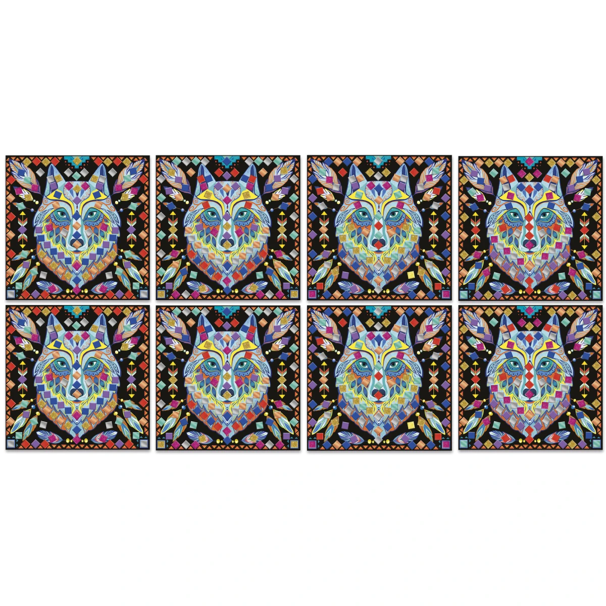 Táto sada na tvorenie obsahuje 8 obrázkov, ktoré sa dajú ozdobiť mozaikami. Všetkých 8 obrázkov je identických a je možné ich prispôsobiť podľa vlastného uváženia! Táto sada obsahuje 8 dosiek (20 x 20 cm) - iba 1 dizajn, 24 malých listov mozaiky (6,5 x 6,5 cm) v 8 farbách (matná, metalická a trblietavá) a 1 brožúrku s návodom a niekoľkými príkladmi.