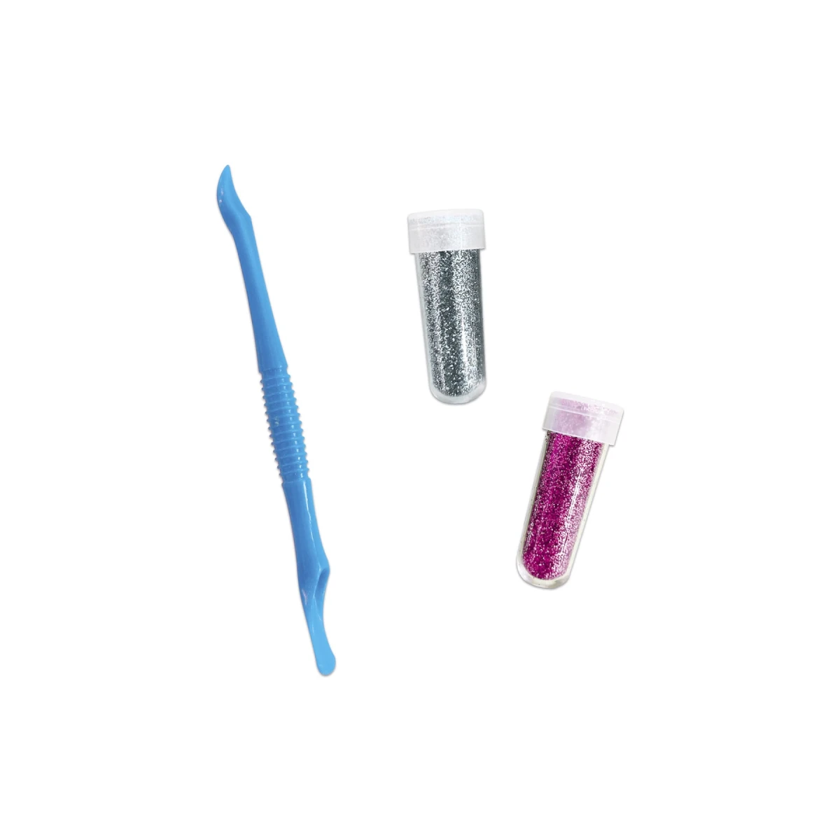 Obsahuje 3 obrázky s vyznačenými oblasťami na ozdobenie, 2 tuby s trblietkami (striebornú a ružovú), 1 plastový nástroj a 1 brožúrku s návodom a vzormi.