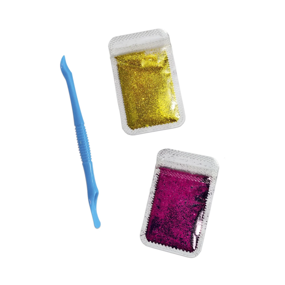 Obsahuje 3 obrázky s vyznačenými oblasťami na ozdobenie (21 x 25 cm), 2 vrecúška s trblietkami na zips (ružové a zlaté), 1 plastový nástroj s 2 rôznymi hrotmi (1 špicatý hrot na odlepovanie papiera chrániaceho oblasti na ozdobenie a 1 lyžičkovú špičku brožúrku s návodom a návrhmi.