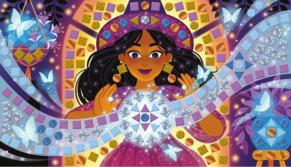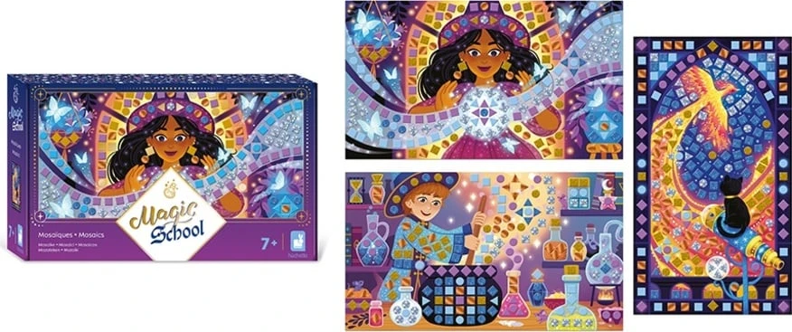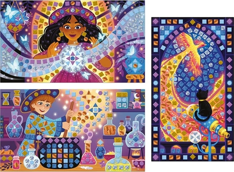 Výhodou tejto kreatívnej krabičky sú mozaiky s rôznymi vizuálnymi efektmi: matné, trblietavé, holografické a metalické. Pre magický a uspokojivý výsledok! Čo sa týka ich penovej textúry, veľmi spríjemňuje činnosť a uľahčuje manipuláciu s mozaikami. Táto manuálna aktivita na tému čarodejnice a kúzelníci ponorí deti do snových scén (rokov Fénixa, kúzlo krištáľovej gule či varenie tajomného kotla).