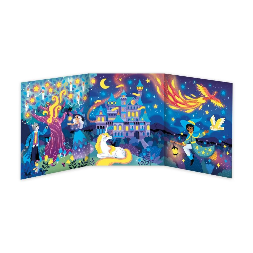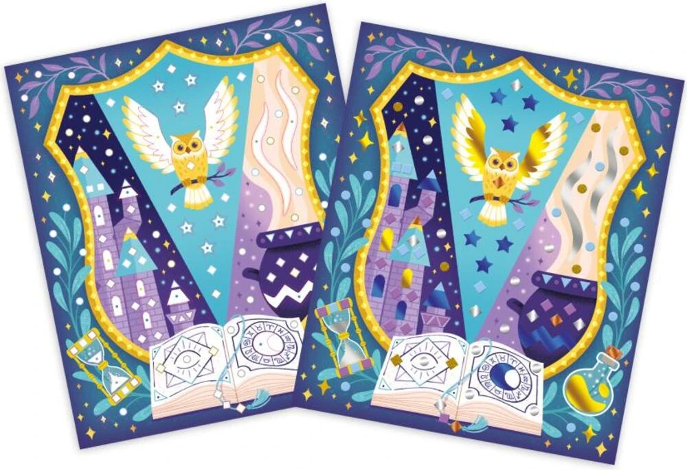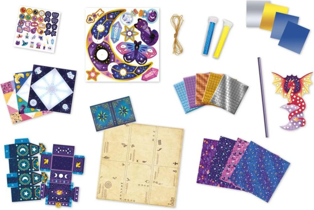 Táto multifunkčná súprava obsahuje: 1 triptychonový pieskový obrázok, 1 masku, 1 čarodejnícky prútik a 1 čarodejnícky erb na doplnenie samolepiacou penovou mozaikou, 1 lapač mesiaca na ozdobenie origami, 3 papierové veštkyne na prispôsobenie nálepkami, 2.