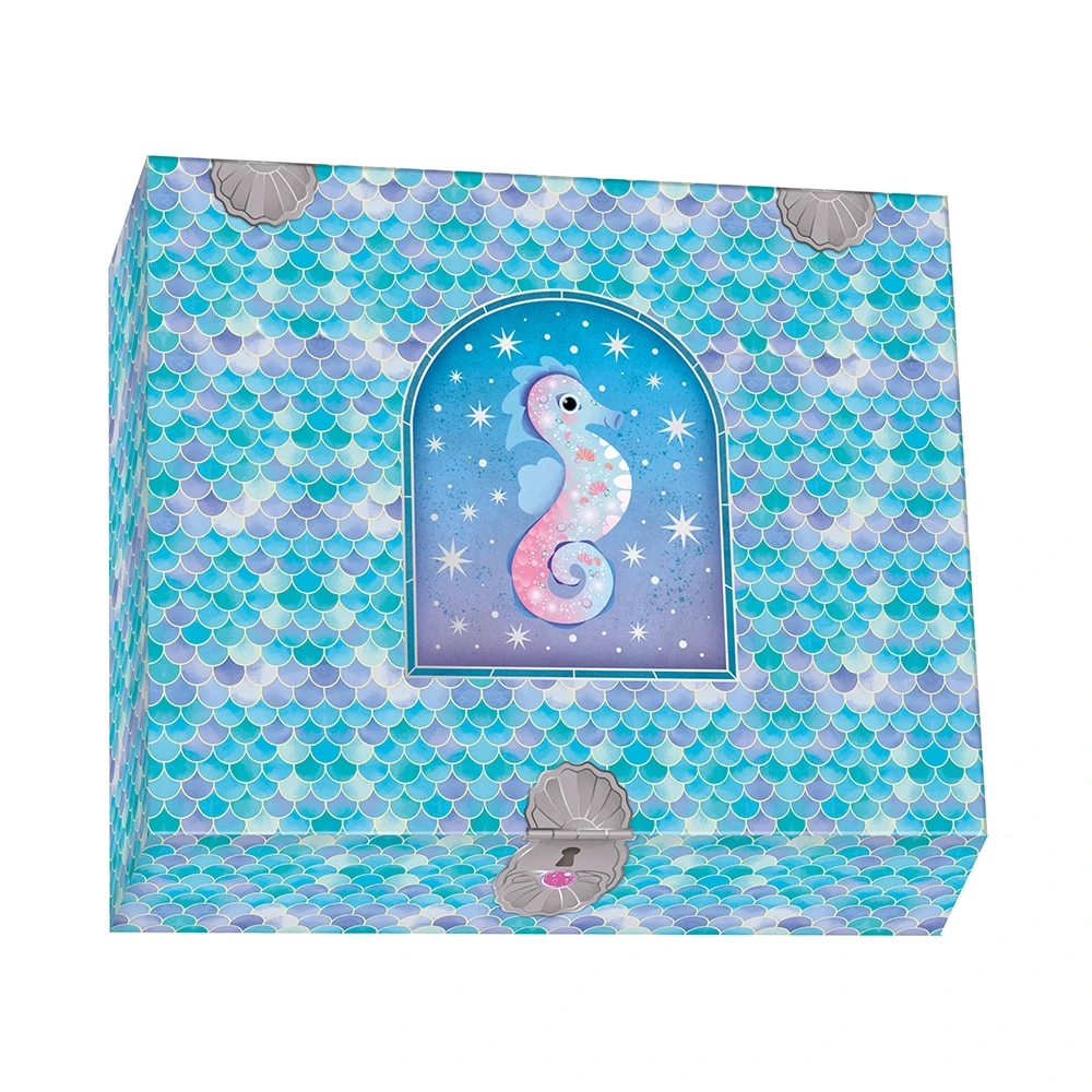 Miniatúrna kreatívna krabička obsahuje: 3 predrezané kartónové dosky, 2 predrezané listy papiera, 1 predrezanú plstenú dosku, 1 list kreppového papiera, 1 tubu lepidla, 1 svetelnú girlandu (vrátane batérií), 2 sklenené fľaštičky, 1 tabuľku 1 perlových perál, 10 bielych perál, 10 fazetovaných perál, zlatú šnúrku, 1 terakotovú kvetináč 1 brožúrku s modelmi a návodmi. Fanúšikovia podmorského sveta budú potešení, že sa budú môcť hrať s postavami, keď bude miestnosť zostavená! Dokončenie modelu potrvá približne 2 hodiny. Ponorte sa do sveta kolekcie „Magický oceán“, kreatívnych sád na voľný čas pre deti na tému hlbokého mora, na tvorivé popoludnie uspávané zvukom vĺn!