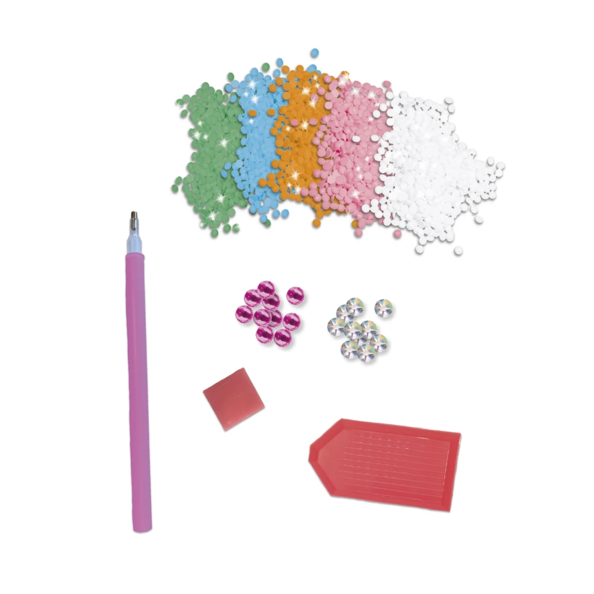 Obsahuje: 1 obrázok (21 x 25 cm), jeden hárok s 20 nálepkami s vopred určenými lepiacimi bodkami, 1200 mini kamienkov v 5 farbách, z ktorých 1 svieti v tme, 20 kamienkov (o rozmeroch 8 mm a 2 farbách), 1 sadu náradia: 1 (ľahko sa zmestí do balenia sady) a 1 brožúrku s návodom a návrhmi.