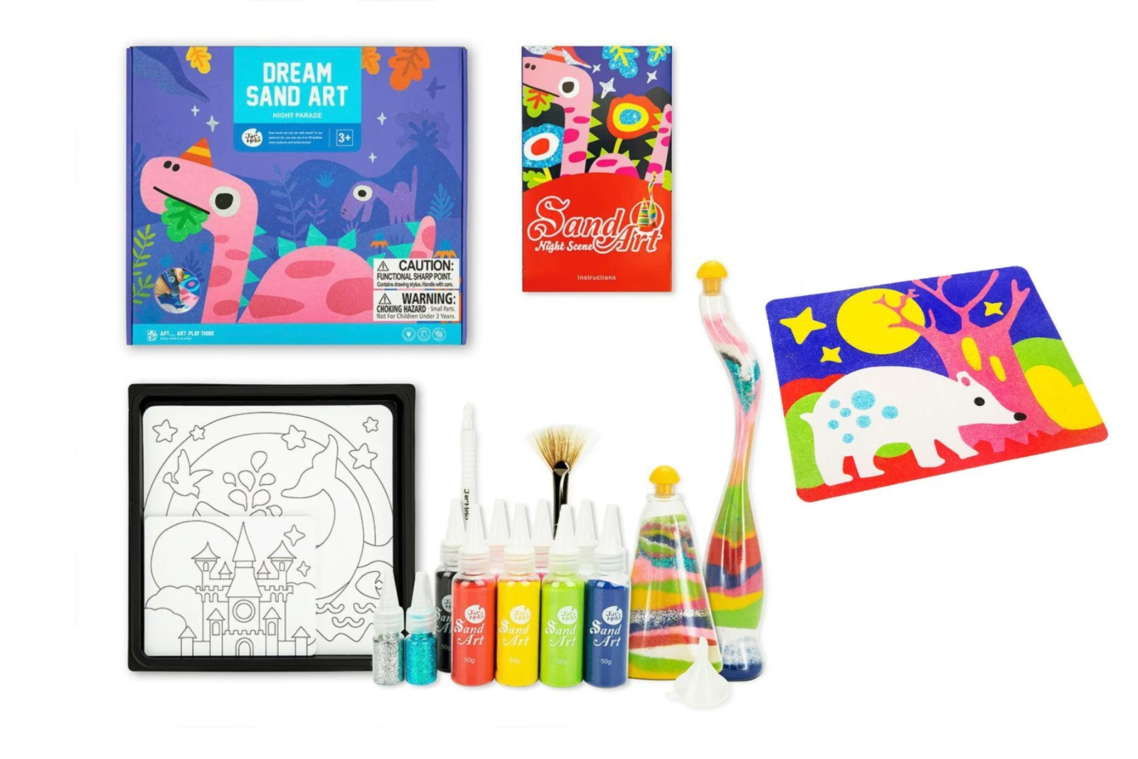 Všetky materiály sú eco-friendly a bezpečné pre deti. Pieskové umenie, ktoré rozvíja tvorivosť podporuje jemnú motoriku, sústredenie a koordináciu ruka-okodeti sa učia pracovať podľa predlohy i tvoriť samostatne rozvíja trpezlivosť, presnosť a zmysel pre detailideálne pre tvorivé popoludnie, detské oslavy či ako darčeky