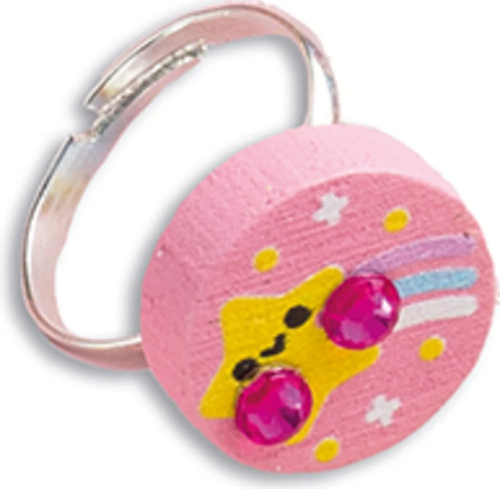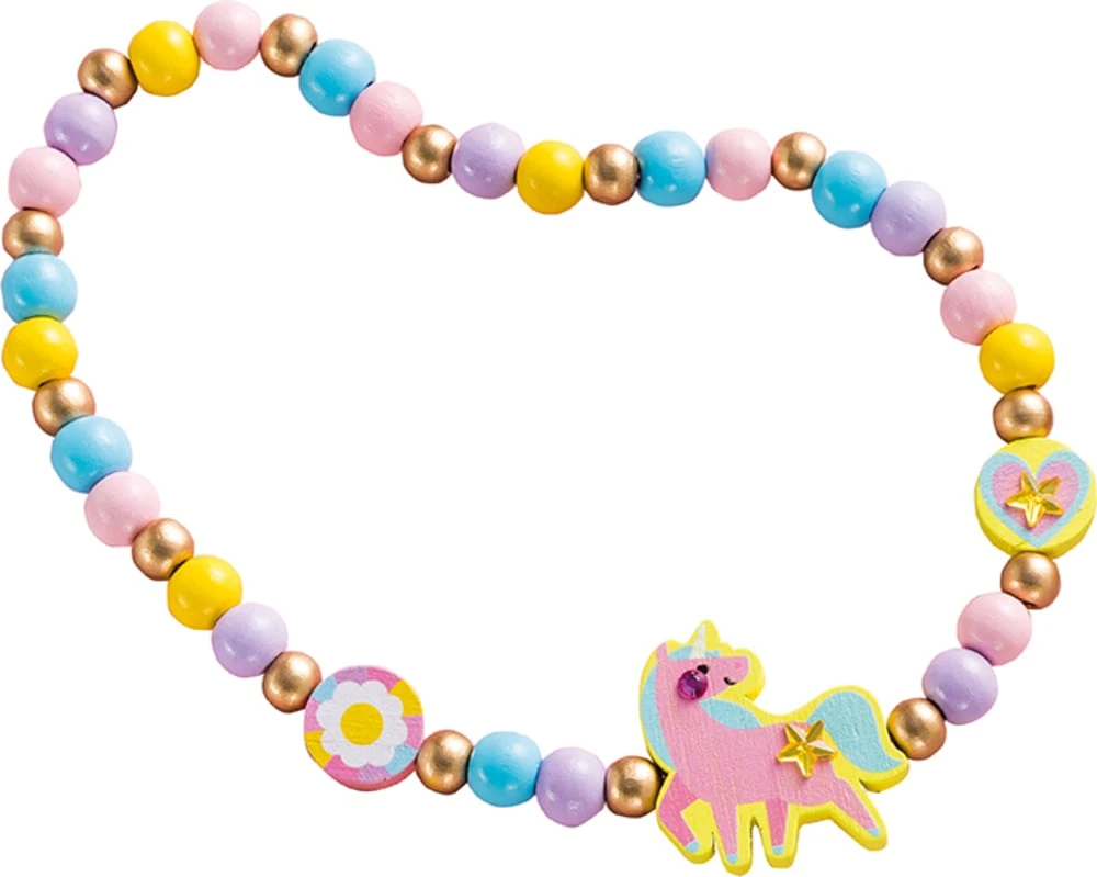Sada obsahuje: 2 tvarované a potlačené drevené korálky, 3 okrúhle drevené korálky s potlačou, 33 farebných okrúhlych korálok, 22 zlatých korálok, 2 prstene s potlačou plochých drevených korálok, 1 list s 8 štrasovými kamienkami, 1 elastická niť, 1