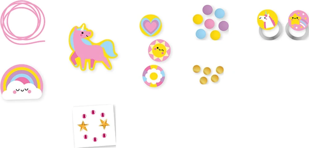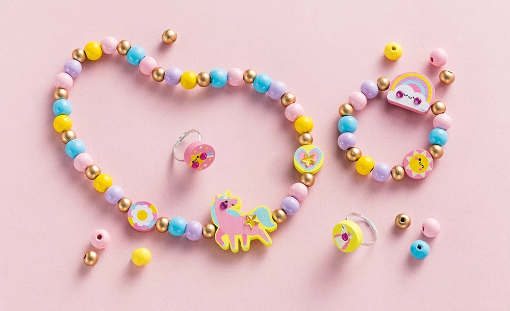 Vytvorte si vlastnú sadu drevených šperkov! Táto sada vám umožní vyrobiť: 1 náhrdelník 1 náramok 2 prstene na tému dúhová krajina Nádherný svet jednorožcov a dúhy.