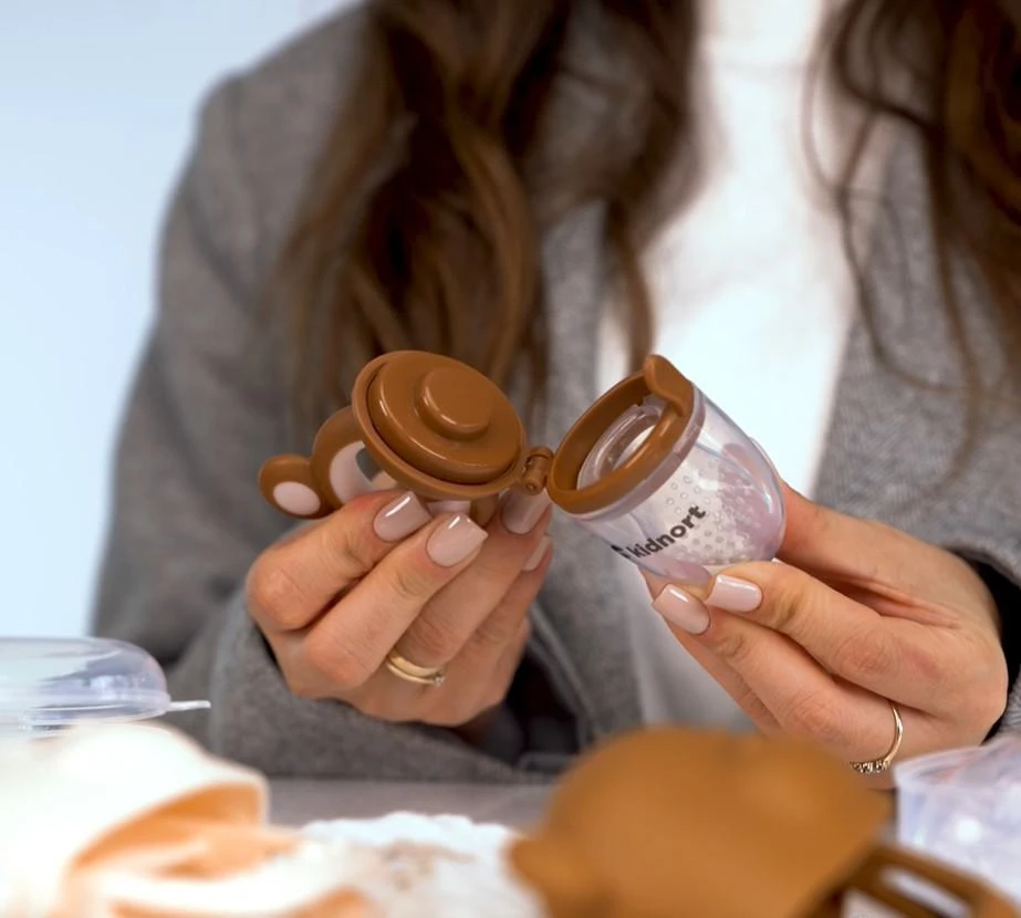 Hryzátko je možné ľahko rozobrať na jednotlivé časti, čo uľahčuje dôkladné umývanie. Zvyšky jedla je možné jednoducho opláchnuť pod teplou vodou. Materiál umožňuje aj sterilizáciu (varením, v mikrovlnnej rúre či sterilizátore). Súčasťou balenia je krytka, ktorá chráni saciu časť pred nečistotami, a praktické puzdro, vďaka ktorému si hryzátko môžete vziať hygienicky kamkoľvek so sebou – ideálne na prechádzky, do kočíka aj na cesty.