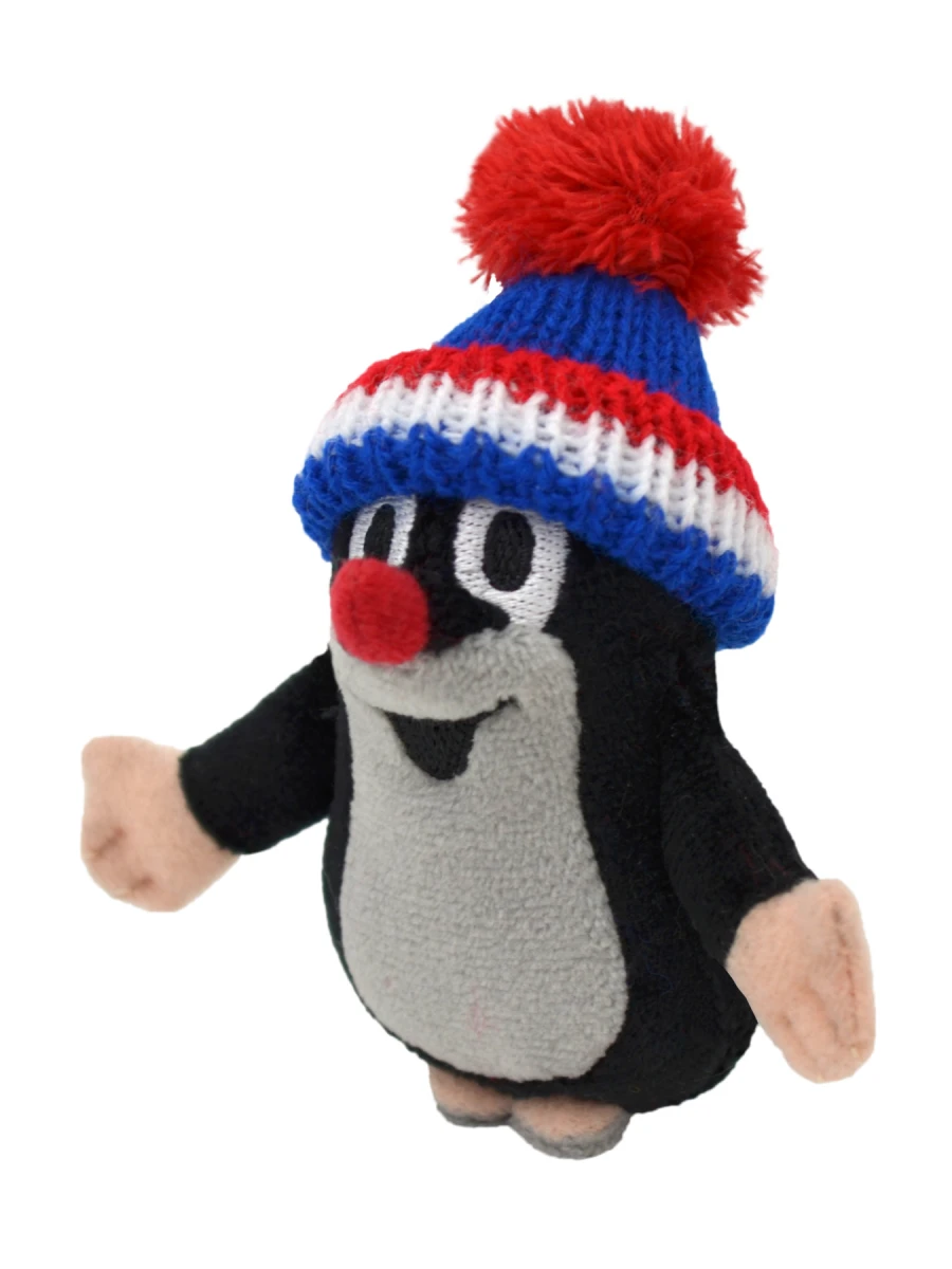 Plyšový Krtko so snímacím čiapkou vo farbe modrej trikolóry.