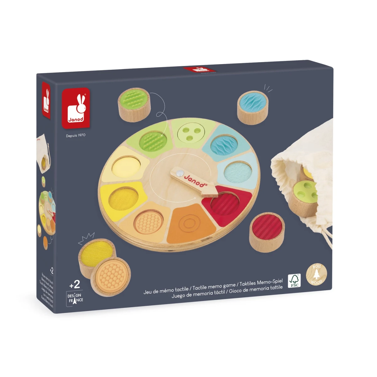 Objavte senzorické koliesko Janods! Toto je hmatová pamäťová hra pre najmenších. Jednoducho roztočte šípku na základni a nájdite zodpovedajúci dielik v bavlnenom vrecúšku len dotykom!