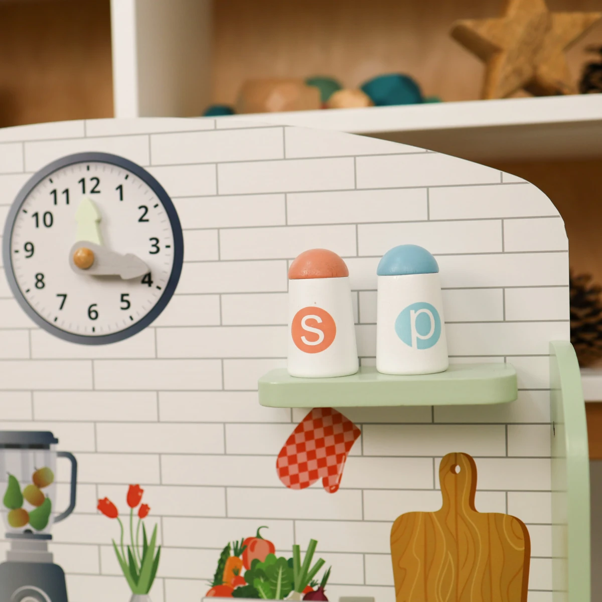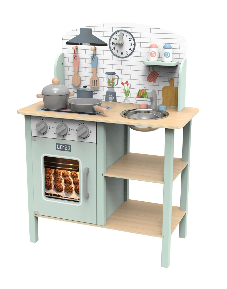 Predstavujeme detskú drevenú kuchyňu v nádherných pastelových farbách od Tooky Toy, vynikajúcu voľbu pre hry na hrdinov, ktoré napodobňujú správanie a profesie dospelých. Táto drevená kuchyňa sa stane jedinečným doplnkom každej detskej izby a podporí kulinársku a cukrársku hru. Okrem kuchyne obsahuje sada ďalších 8 drevených doplnkov, ako sú hrnce a kuchynské náčinie. Kuchyňa má hodiny, rúru, kohútiky a drez, aby bola hra ešte príjemnejšia a realistickejšia.